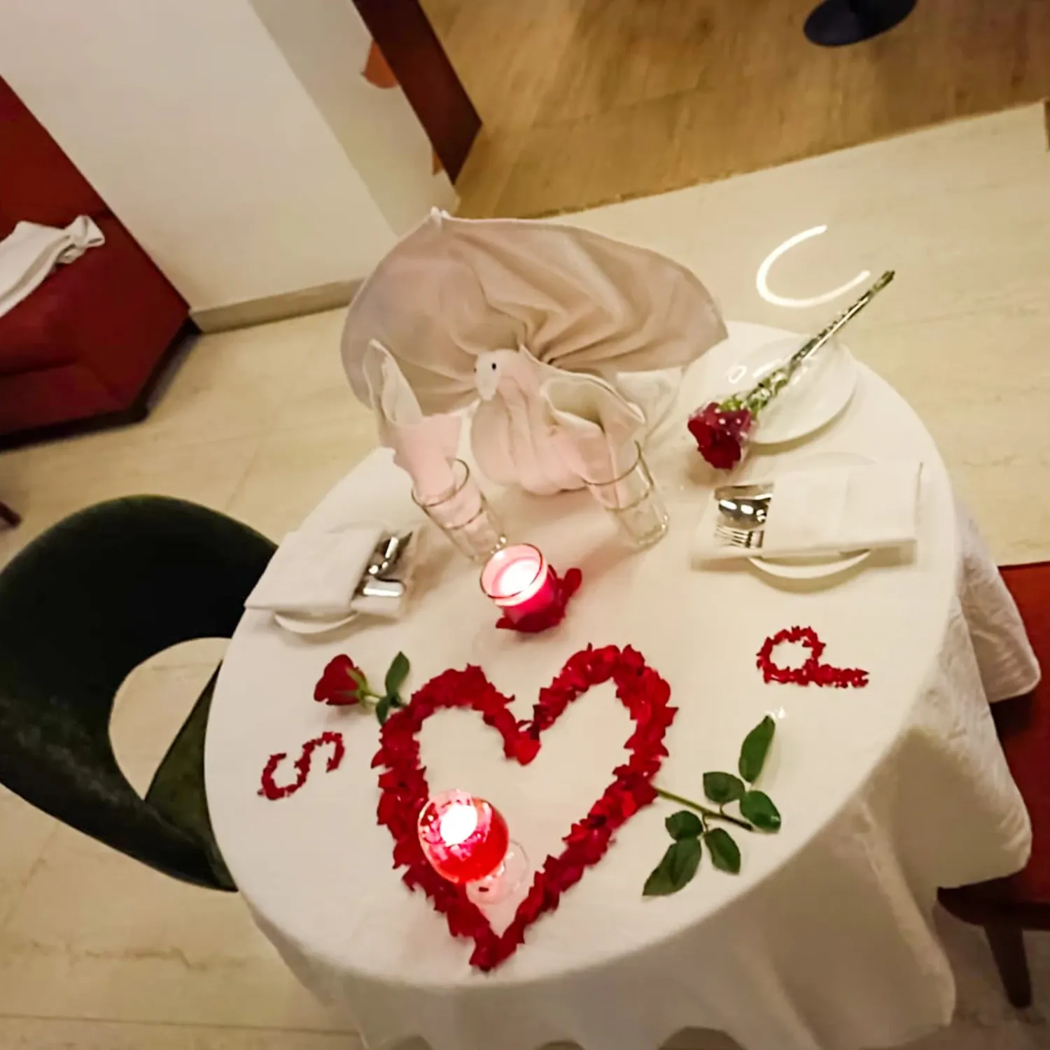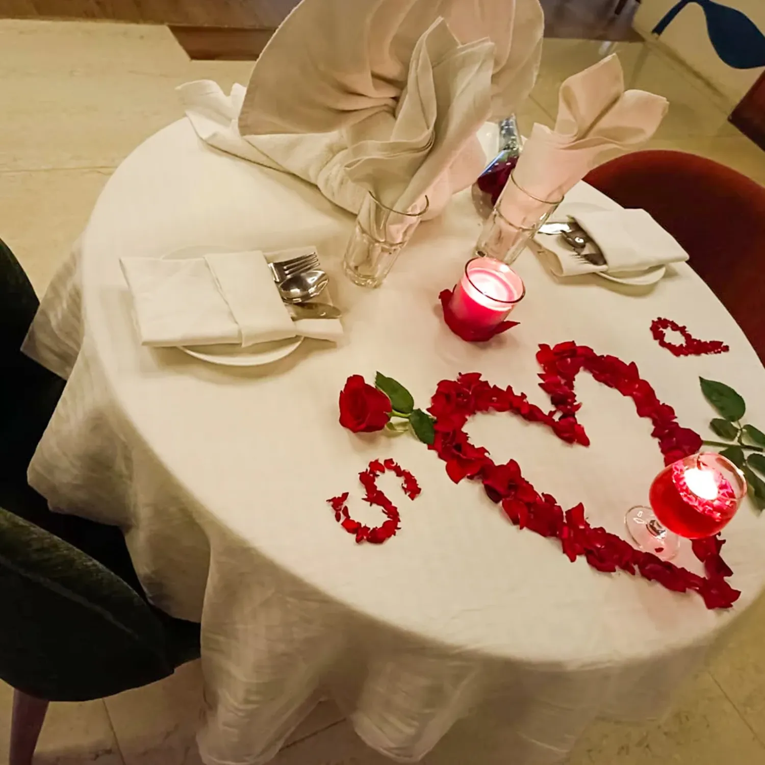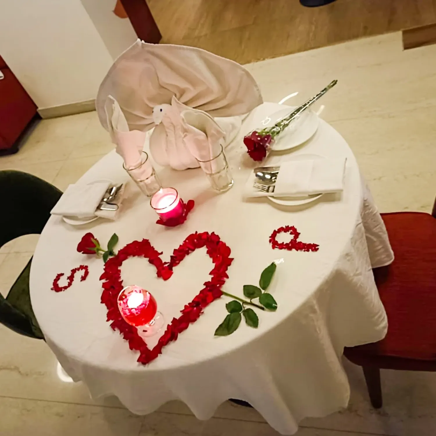A romantic candlelight dinner experience with an elegantly decorated setup.