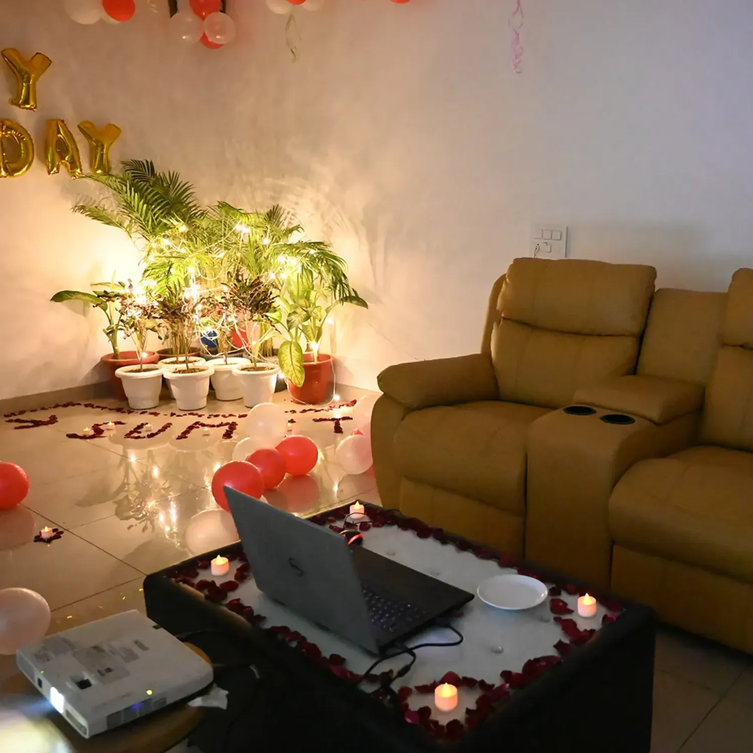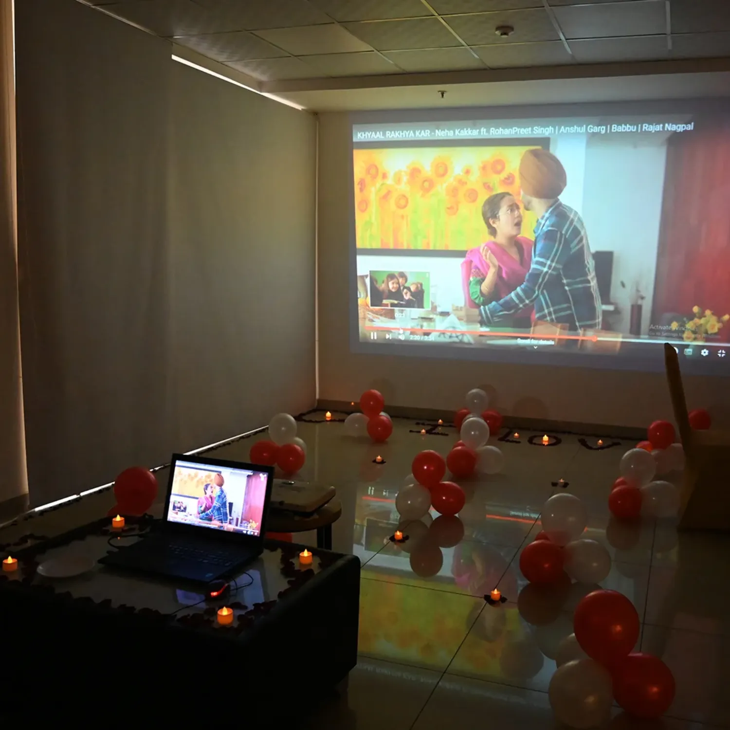 Indulge in a truly romantic experience with this private candlelight dinner and movie date setup.