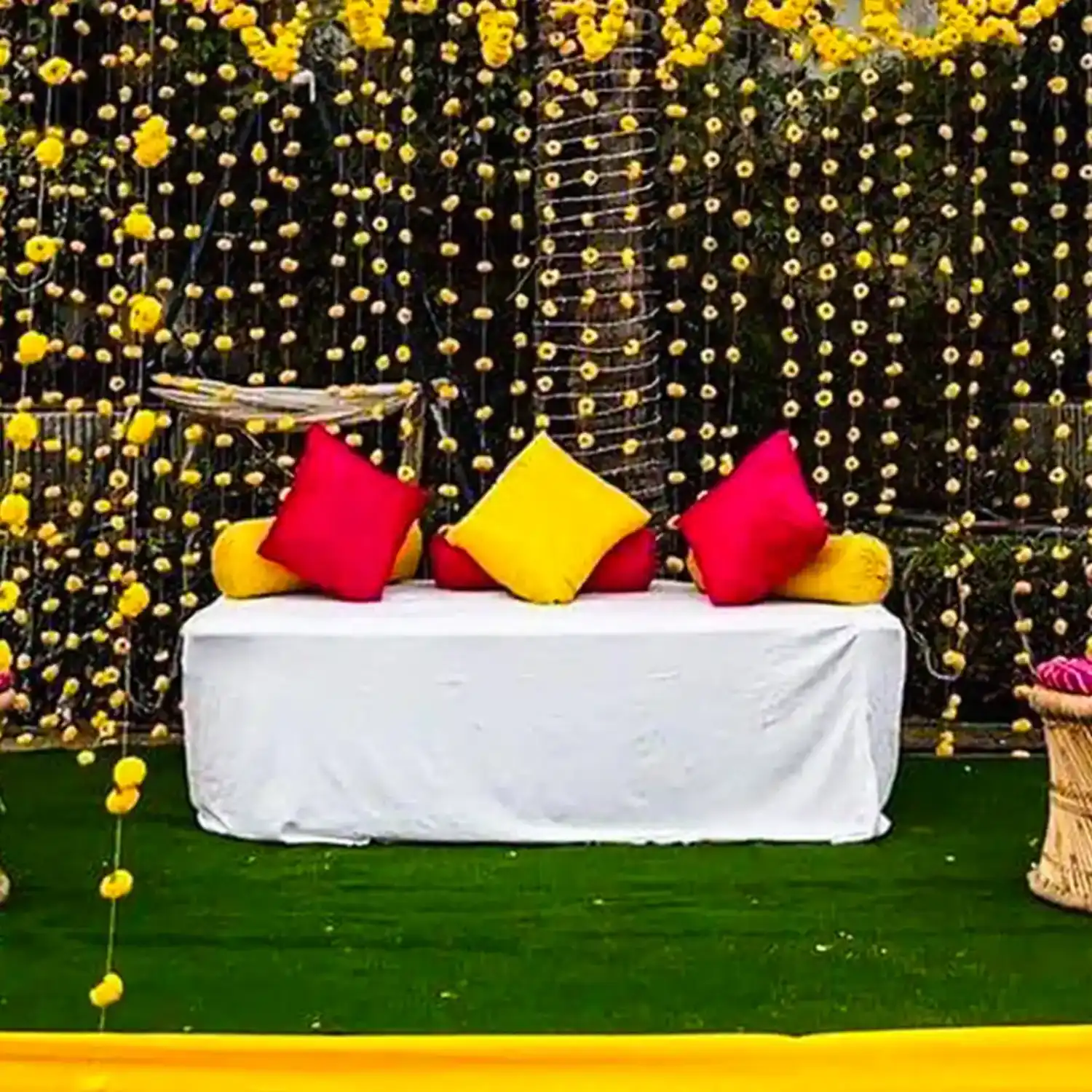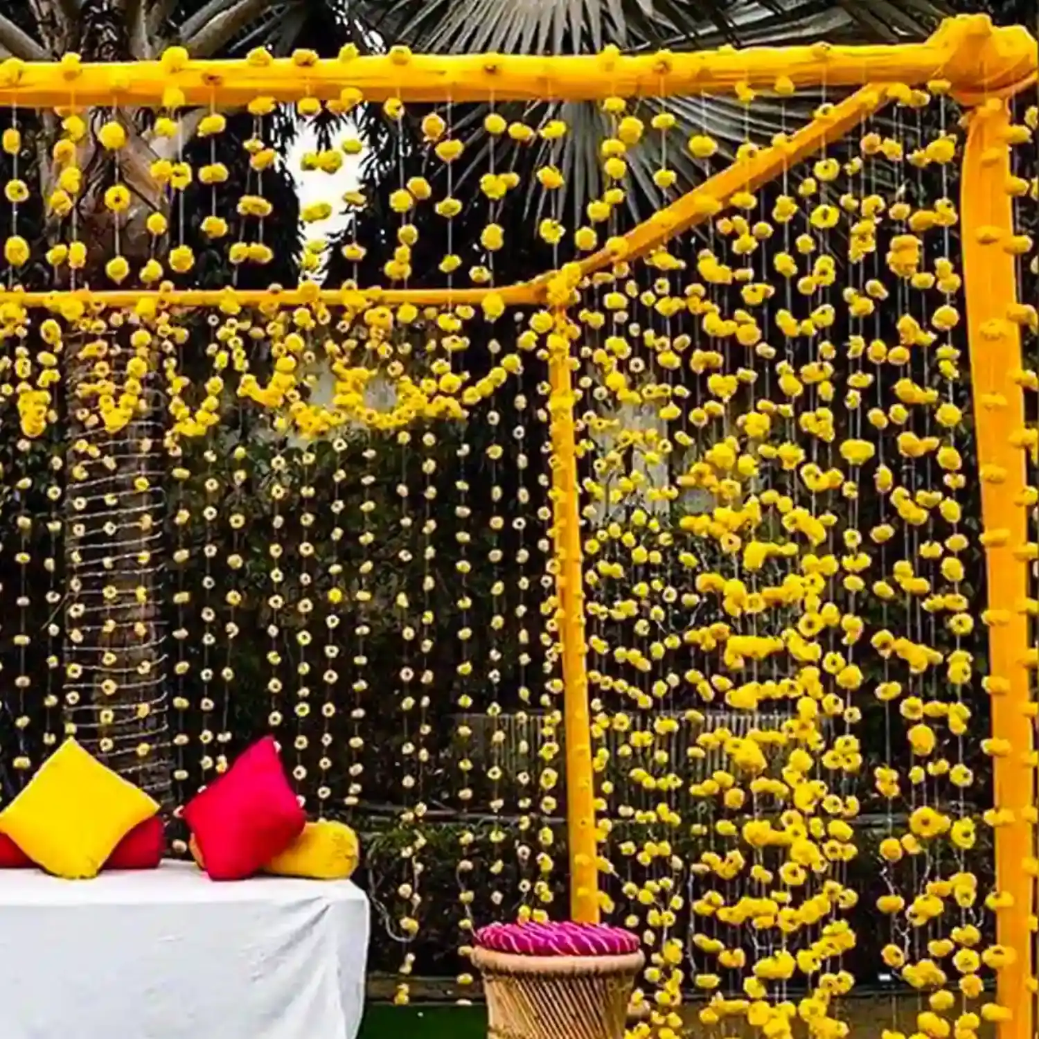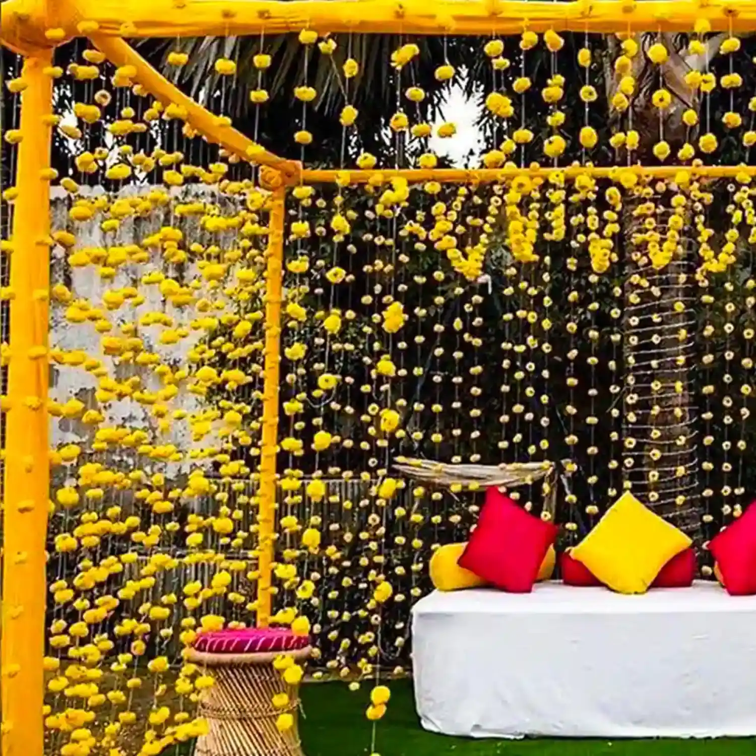 • Yellow Real Marigold Chains Hanging across the Setup