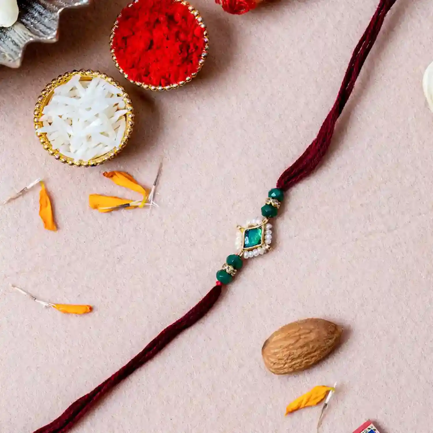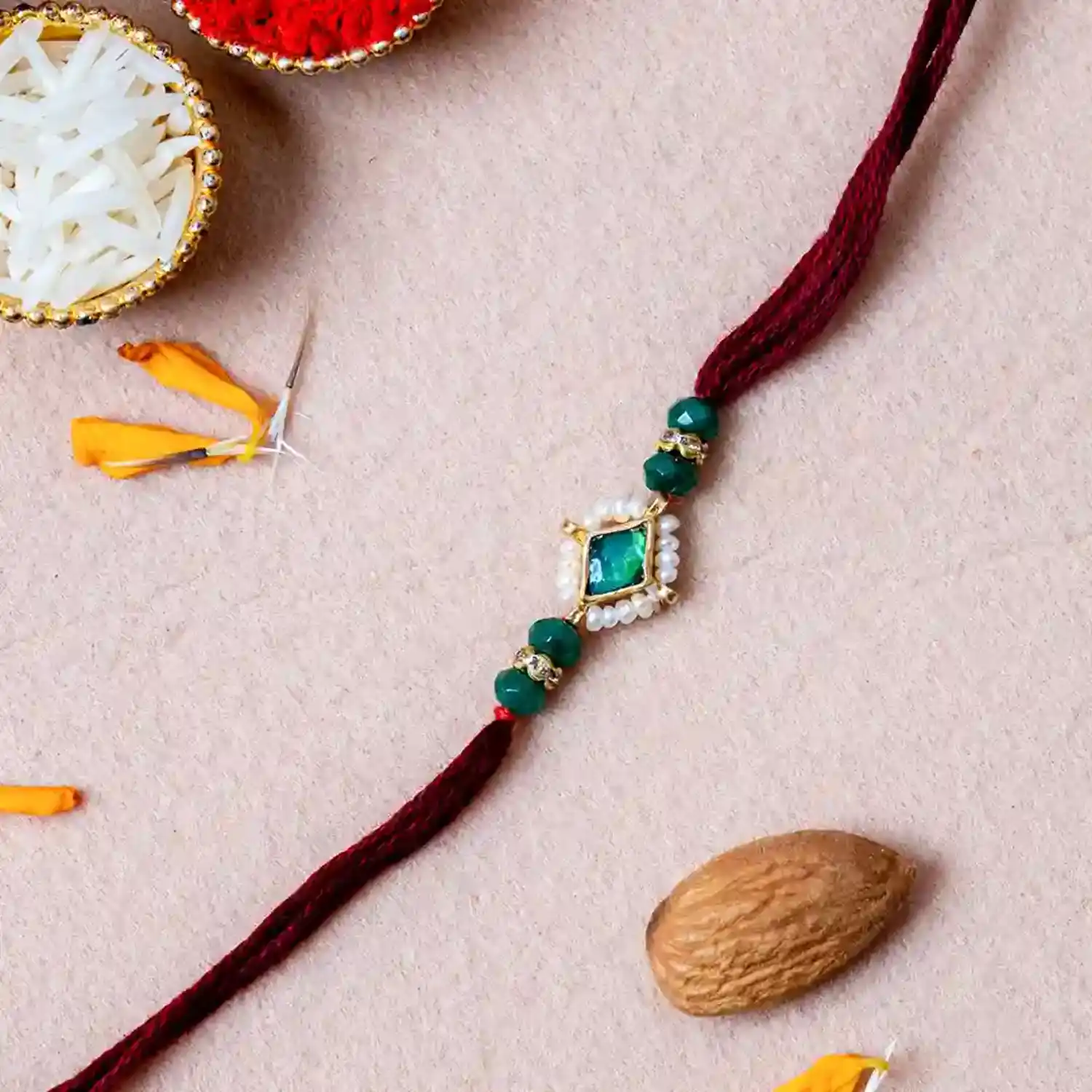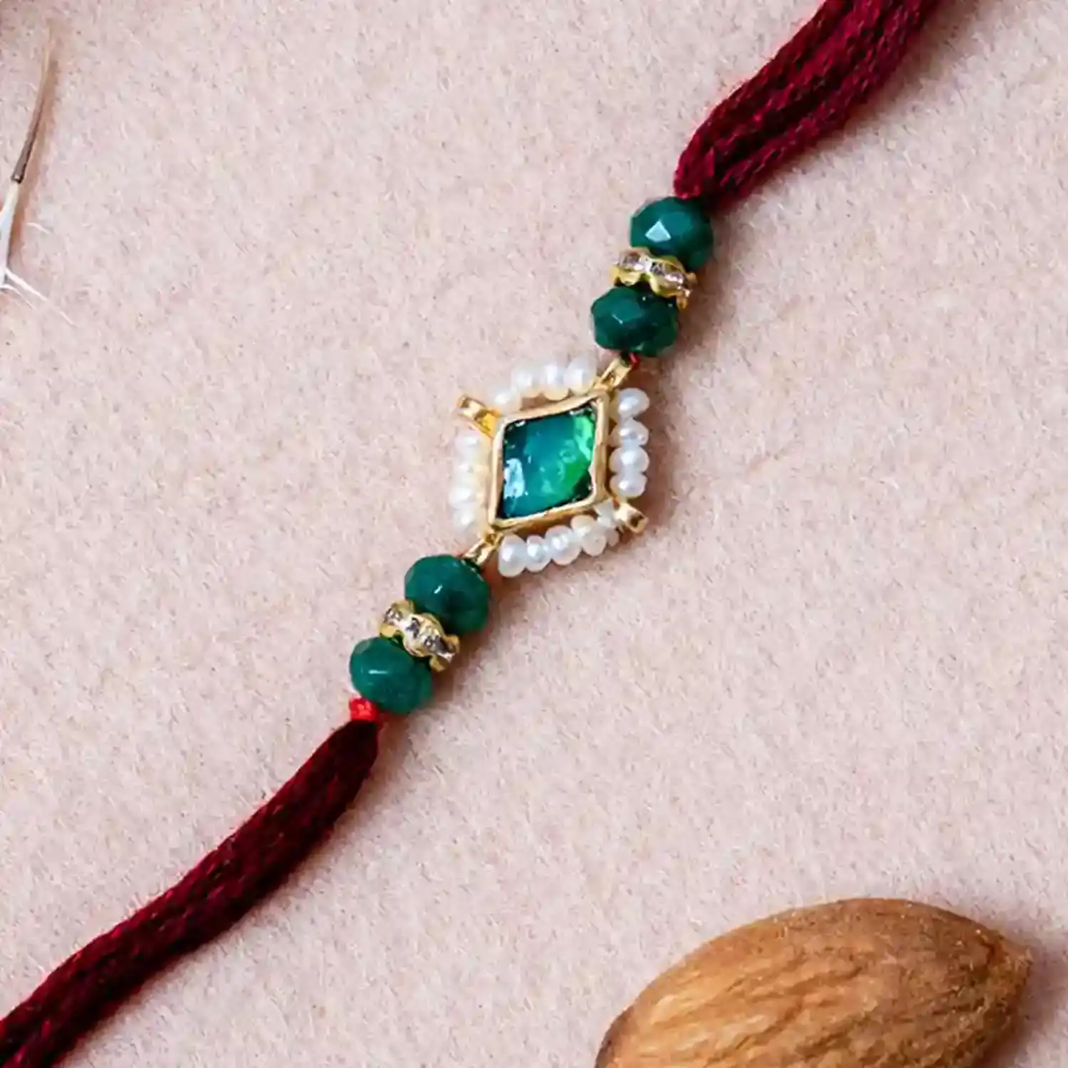 Designer Silver Rakhi with Green Kundan and tiny white pearls.