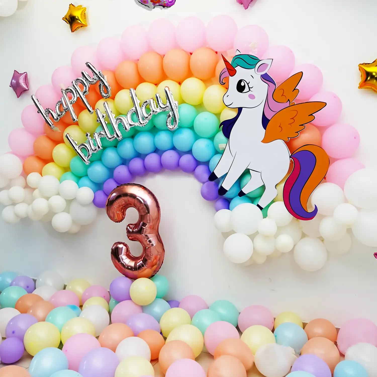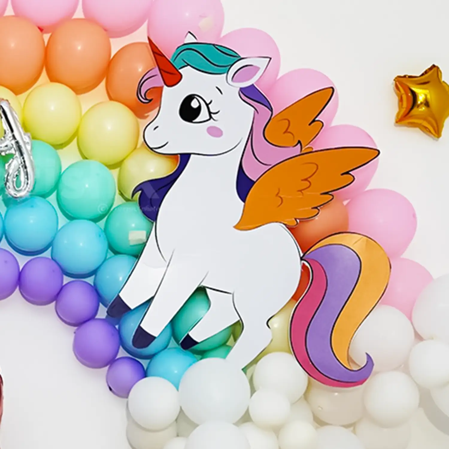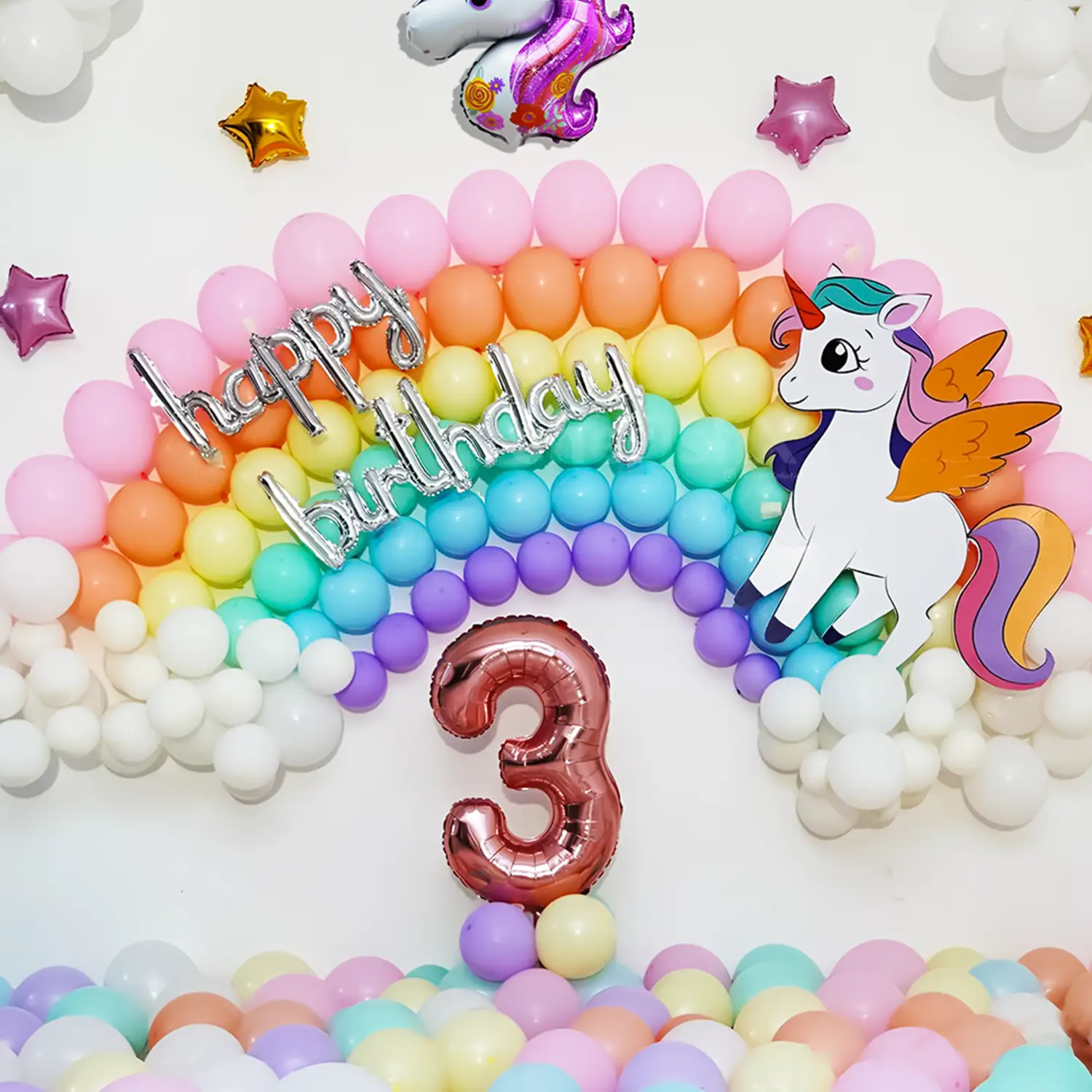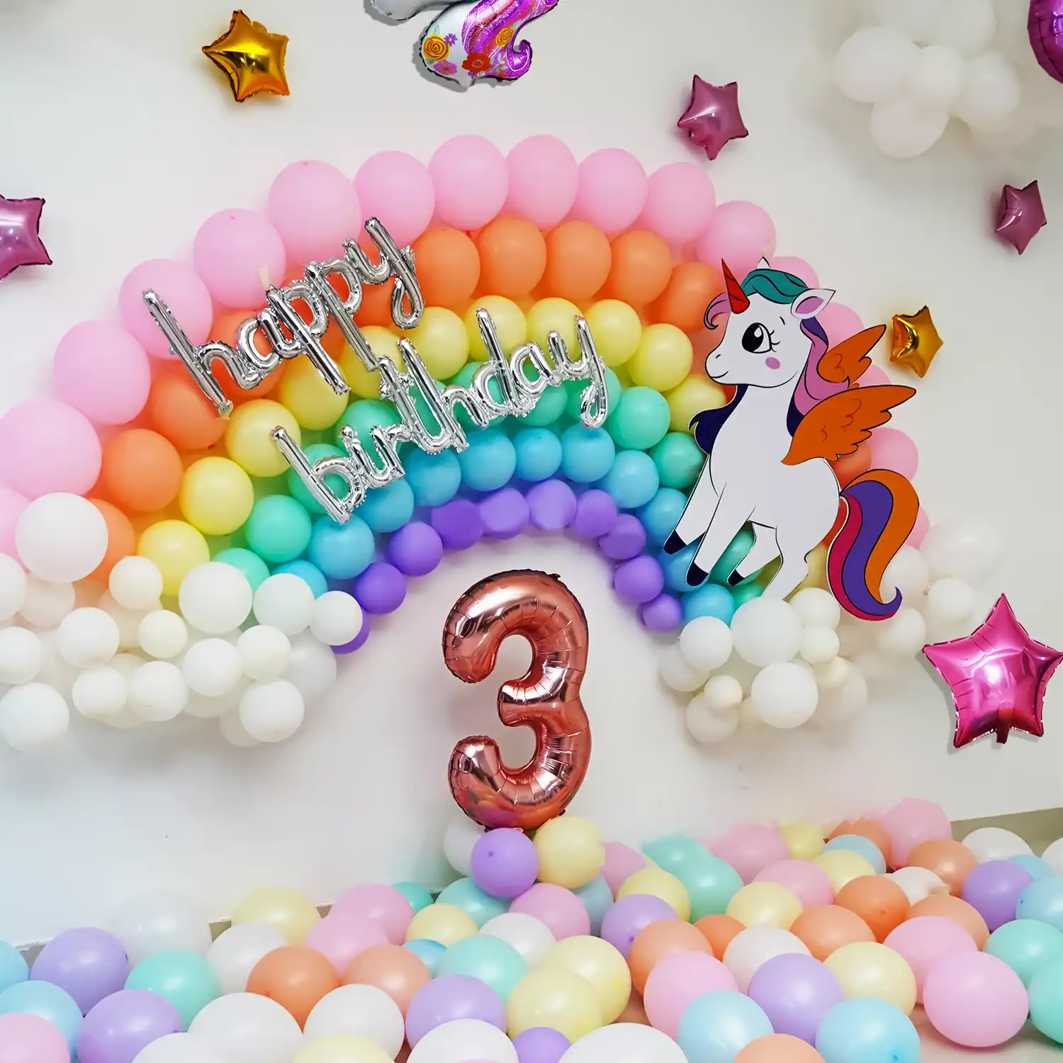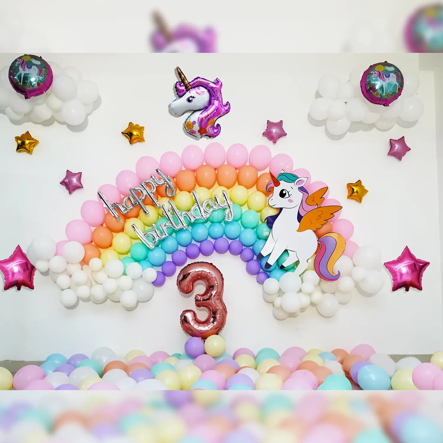 A colourful balloon decor highlighting a rainbow, stars & clouds for kids.