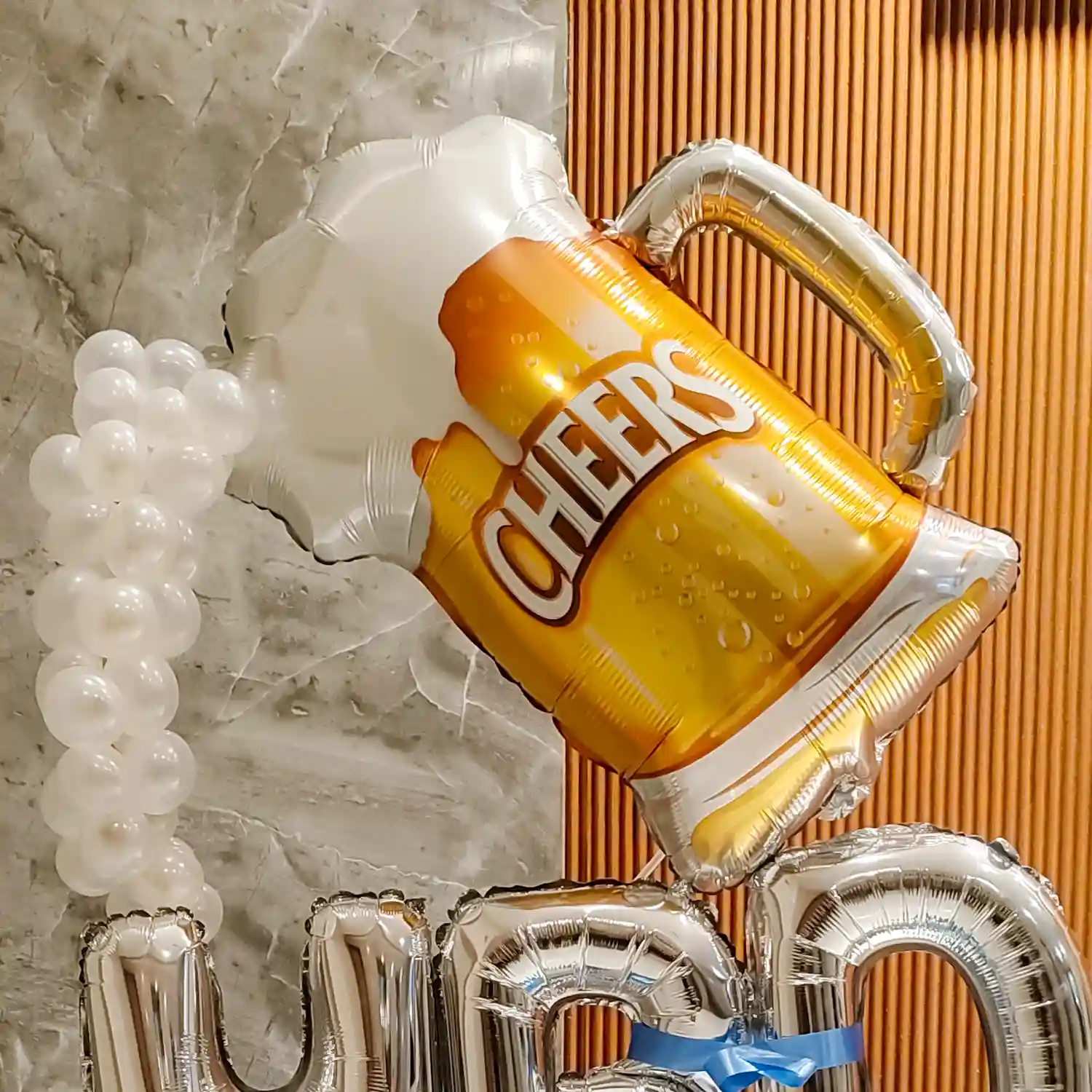 A trendy cheers balloon bouquet for birthdays.