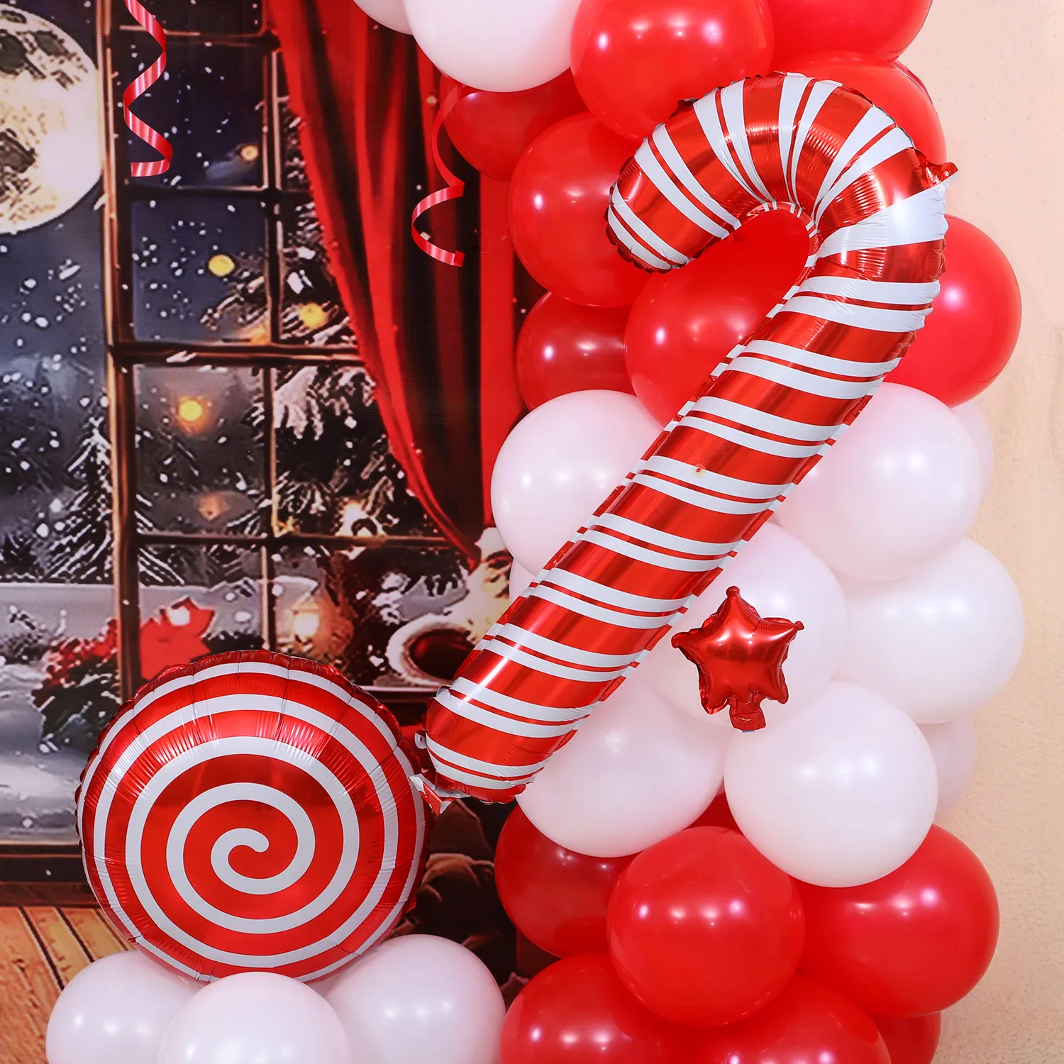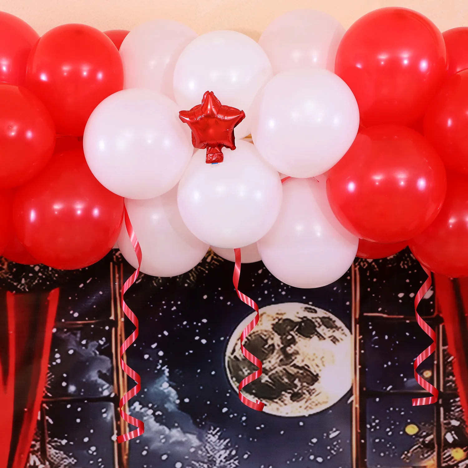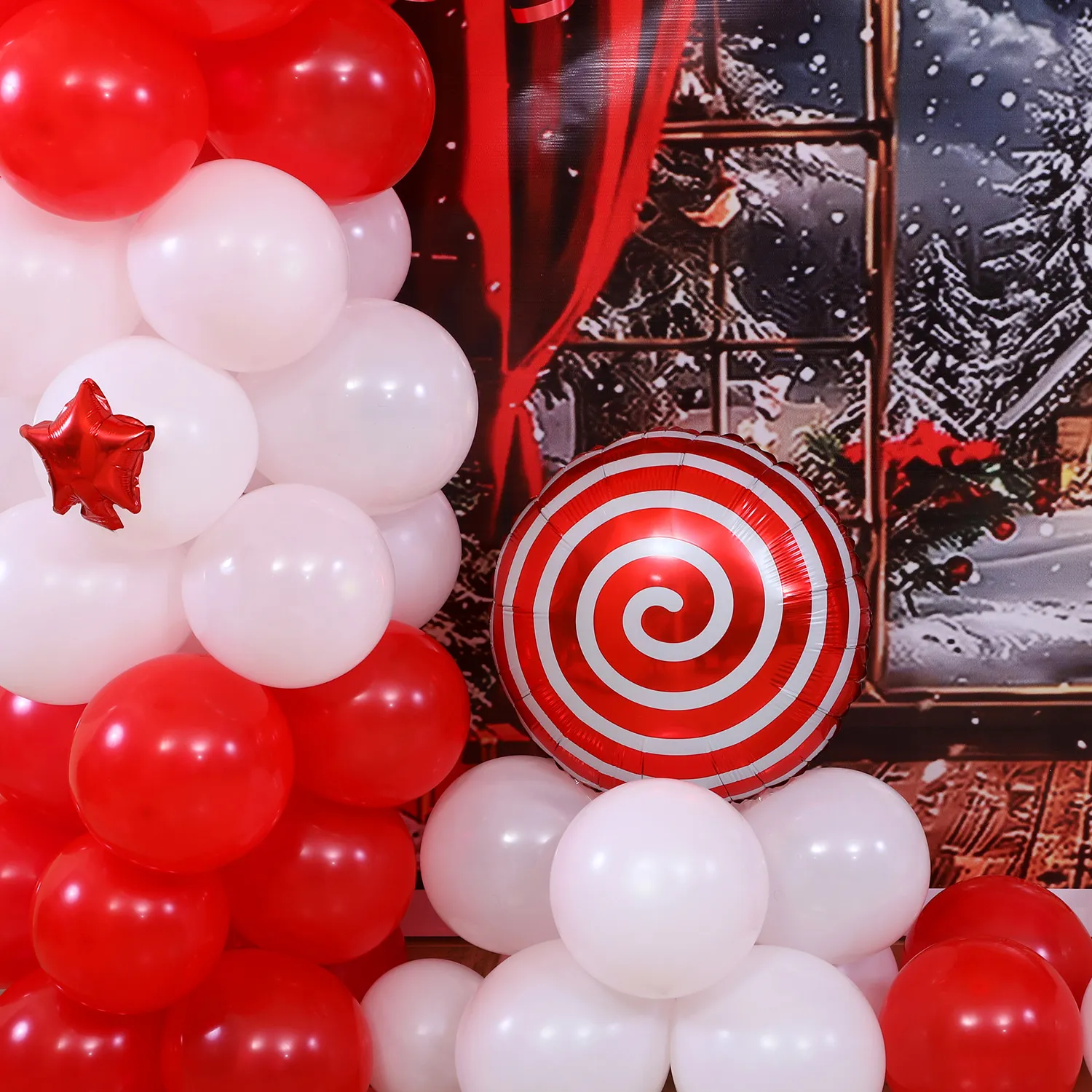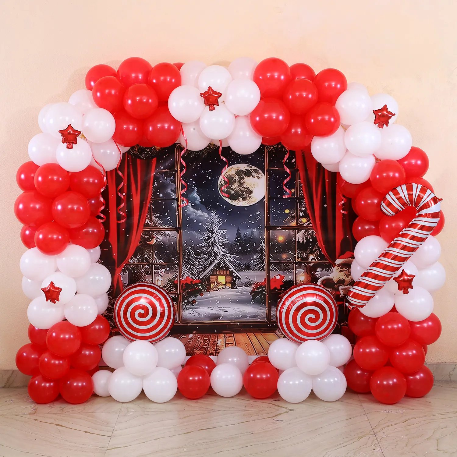Make your Christmas celebrations magical with our Backdrop Balloon Decoration – festive flex, red and white balloon arch, candy foils, and heart foil balloons.