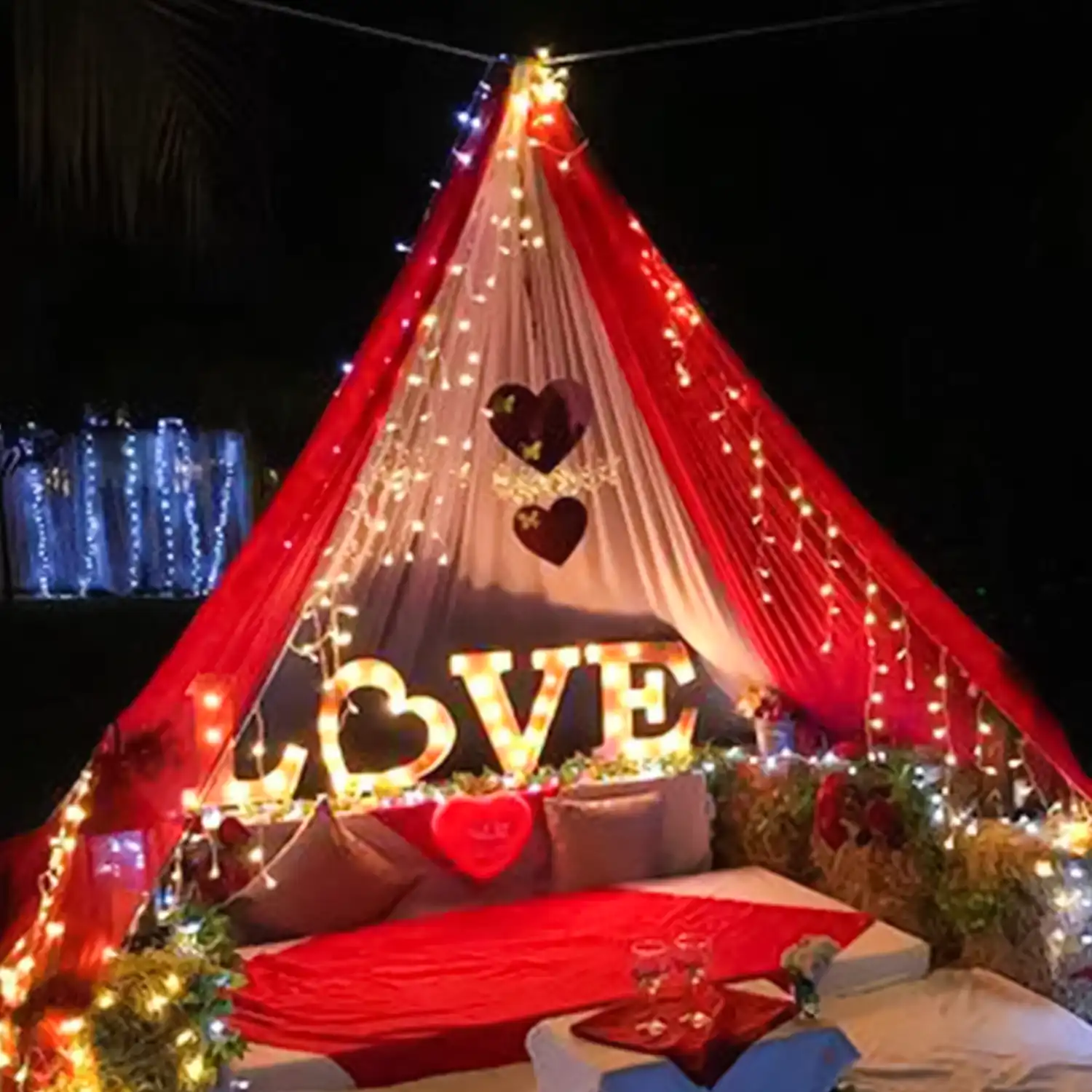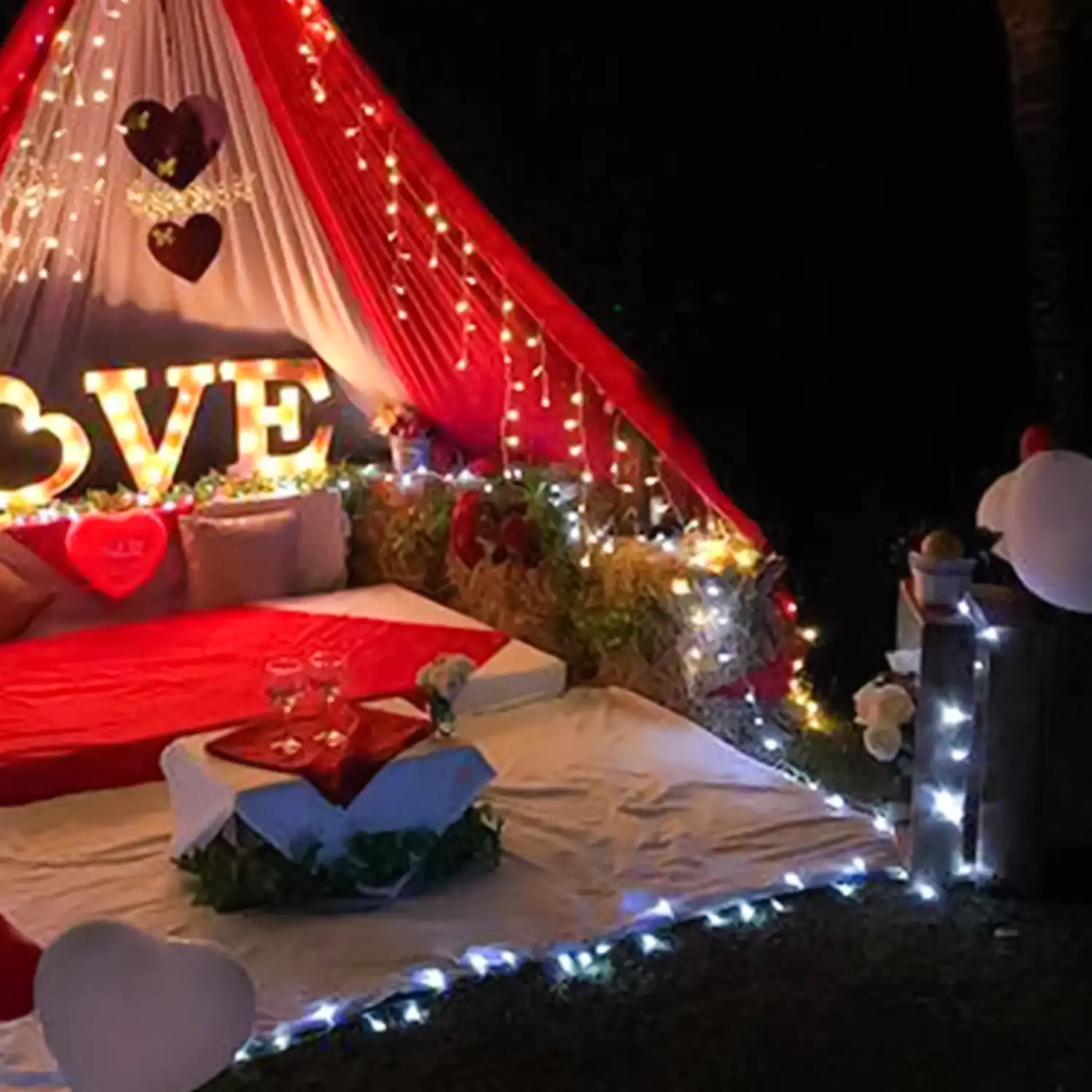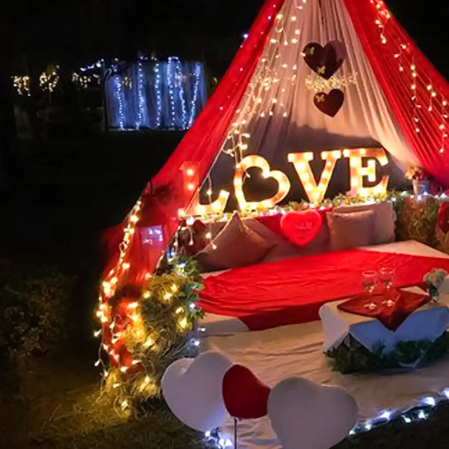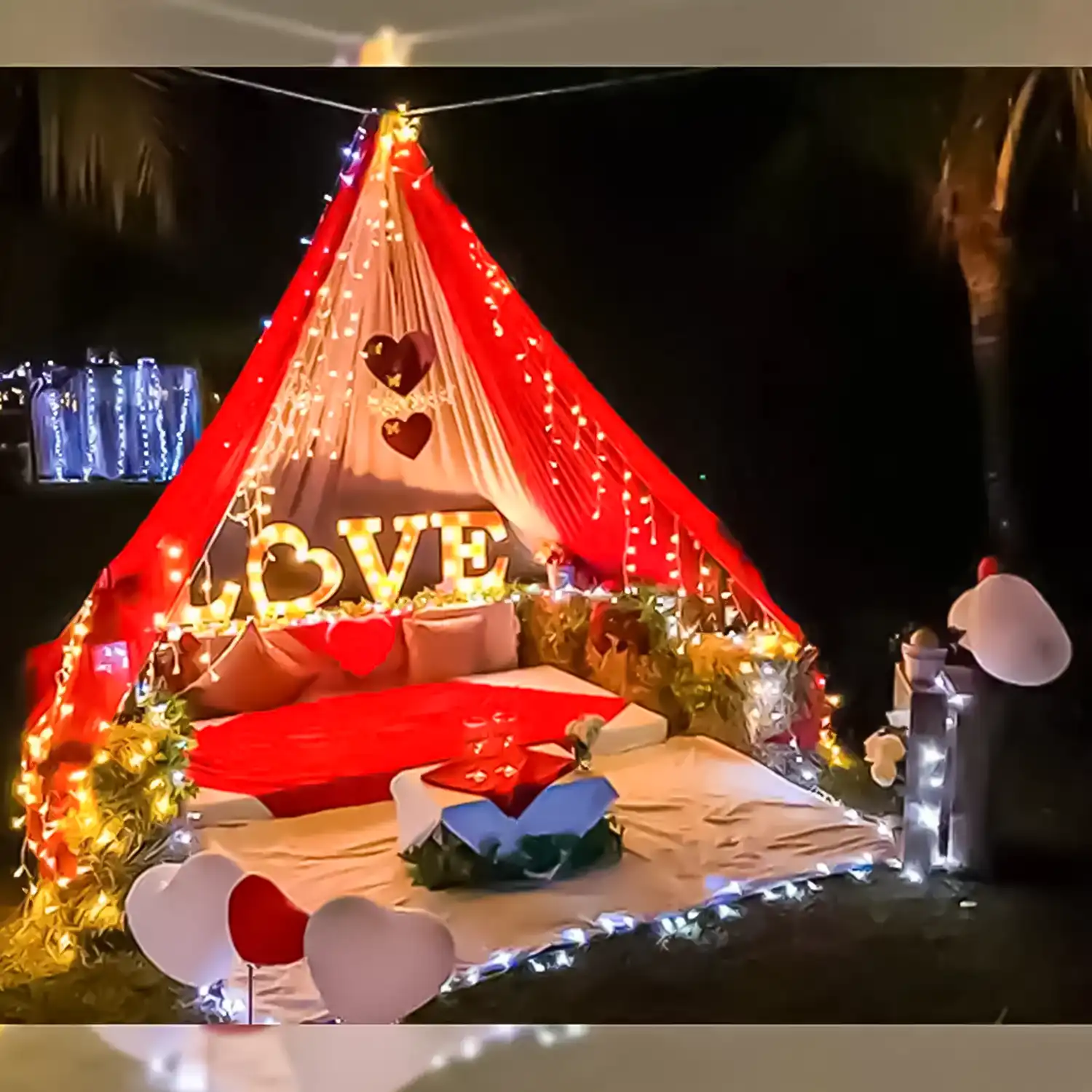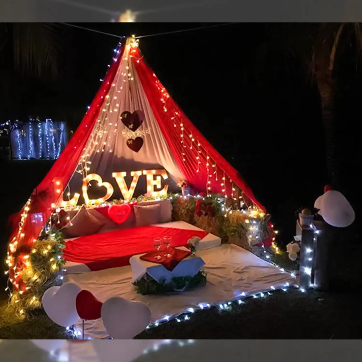 A beautiful canopy decorated with balloons and more.