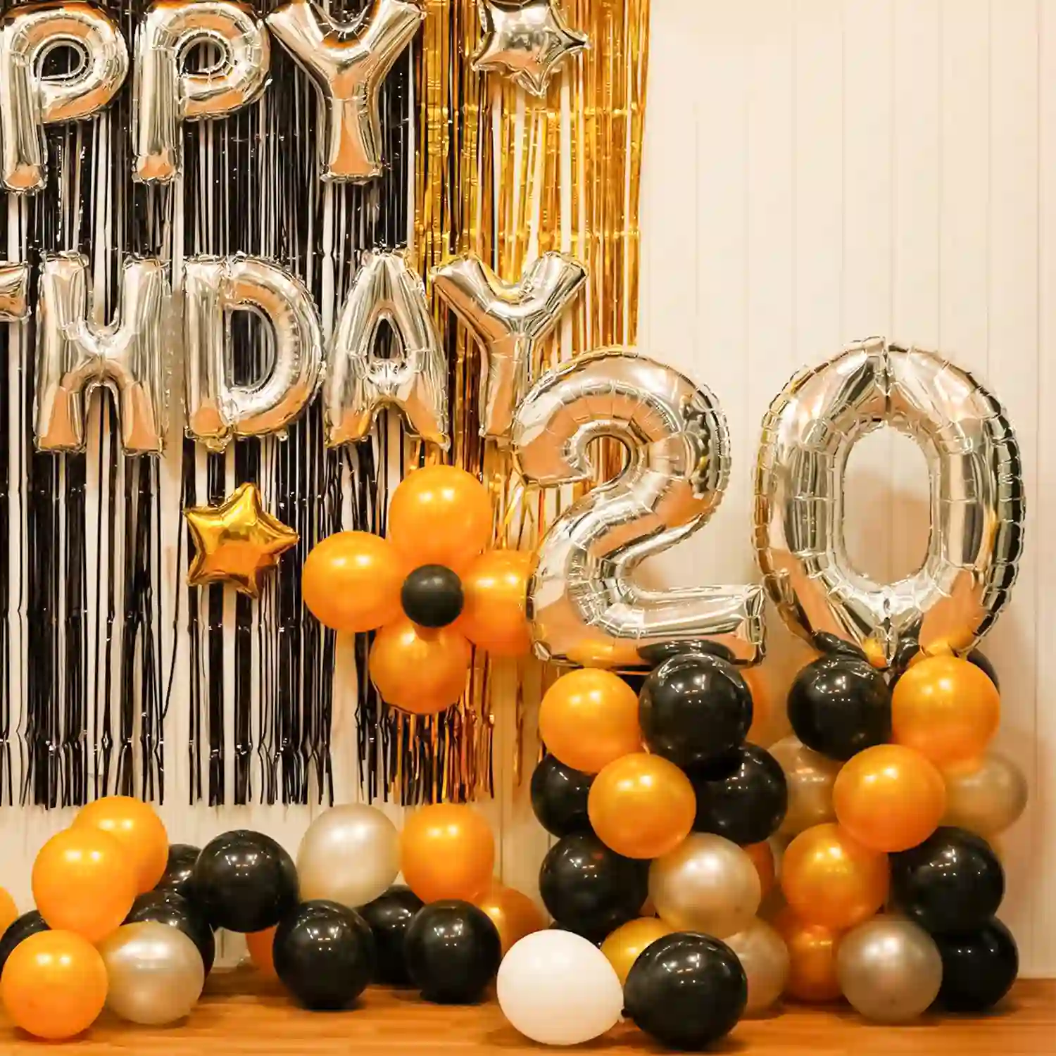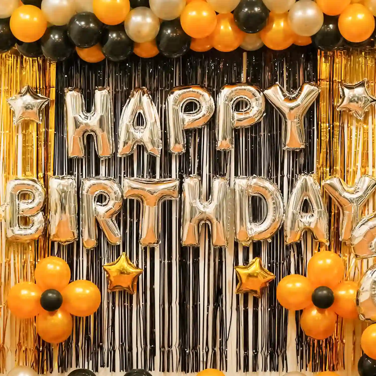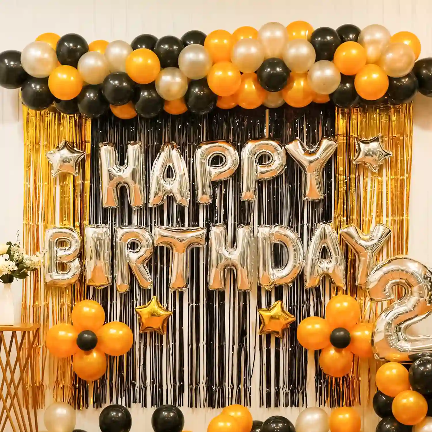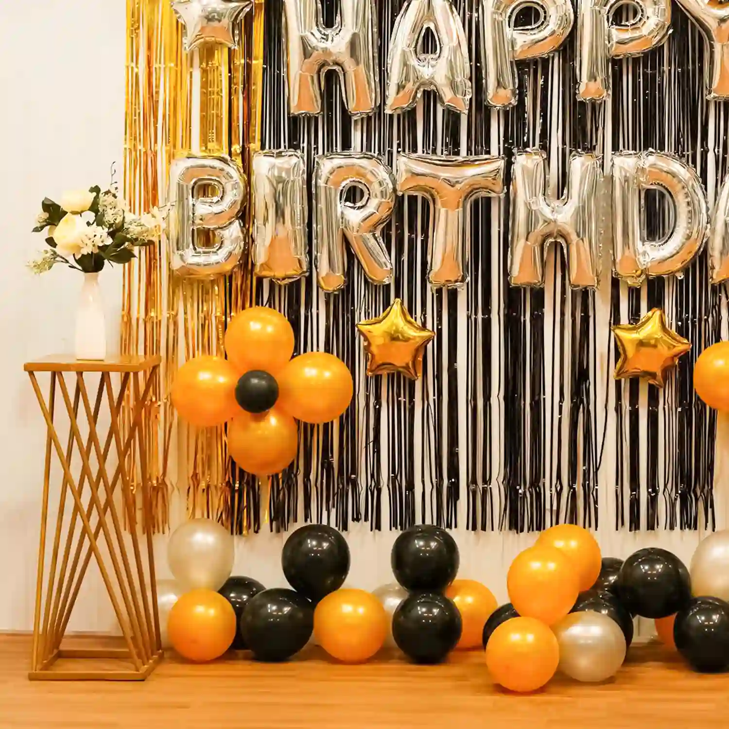 Step into a world of elegance with this black, golden, and silver birthday decor!