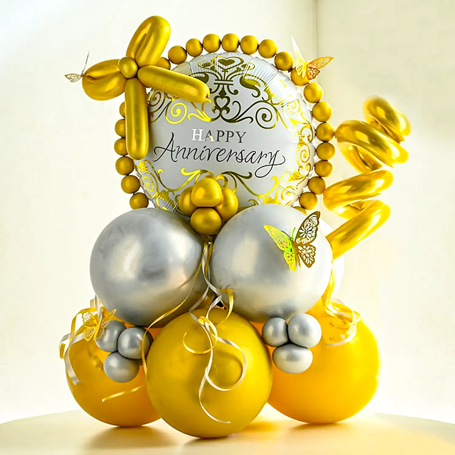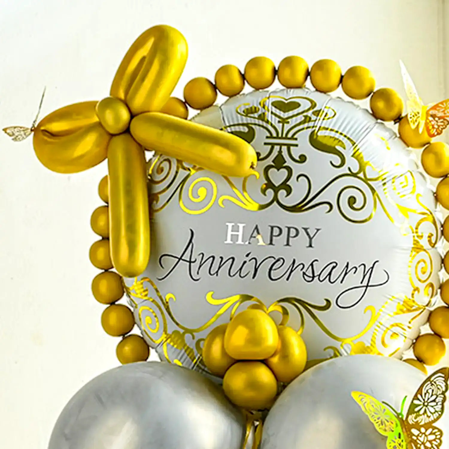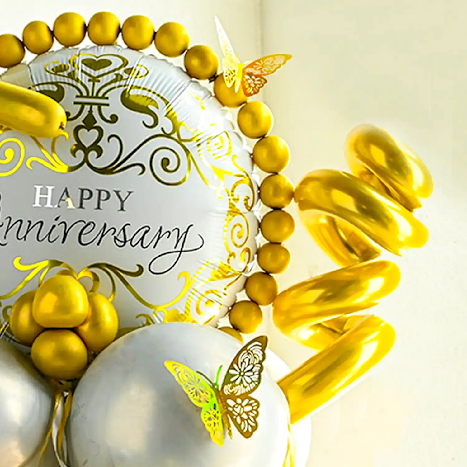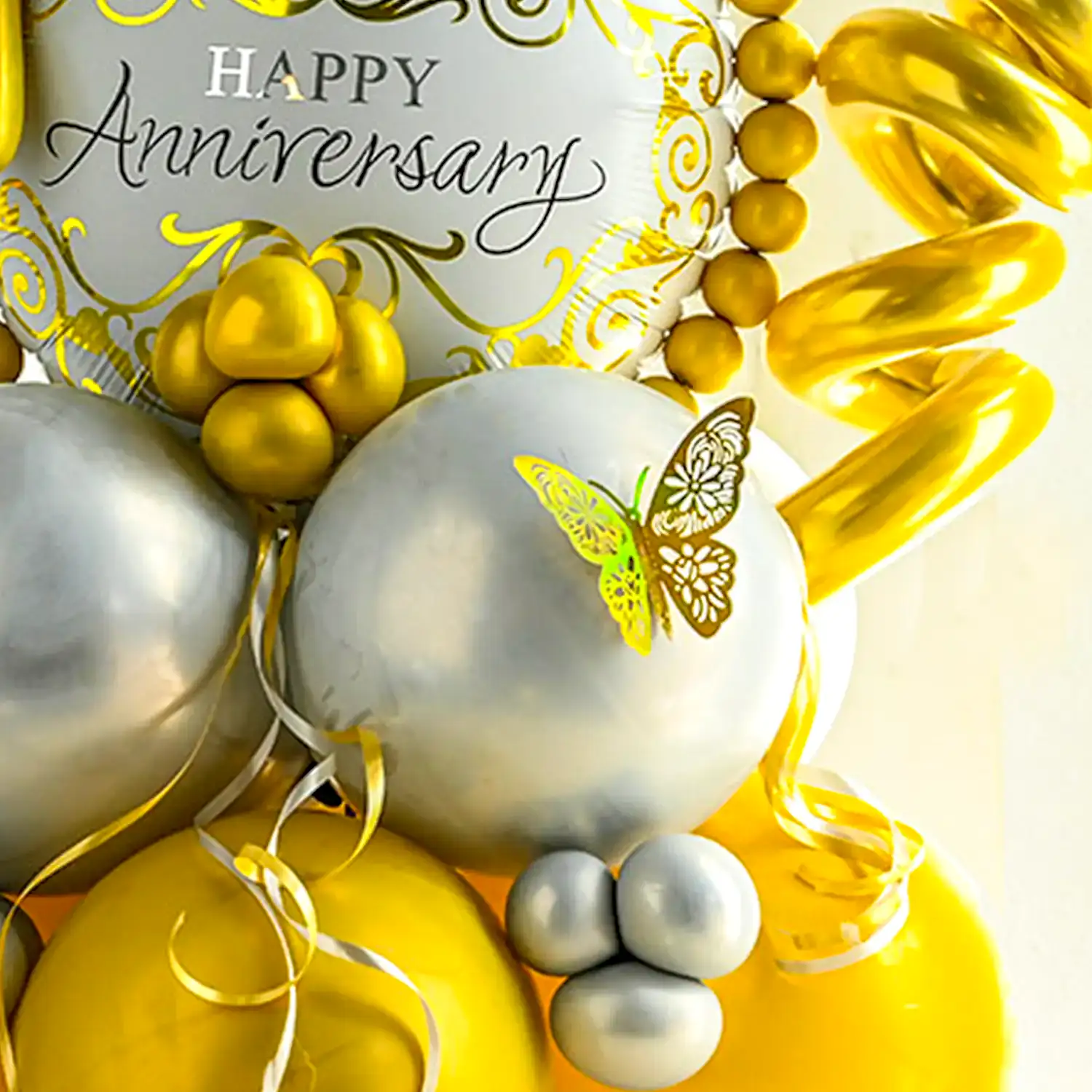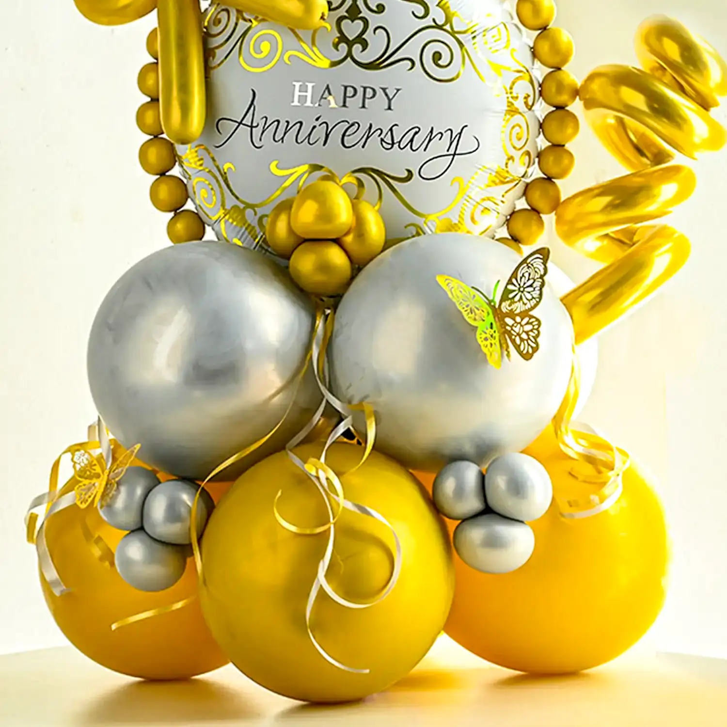 Celebrate your years of love with this golden and silver anniversary balloon bouquet.
