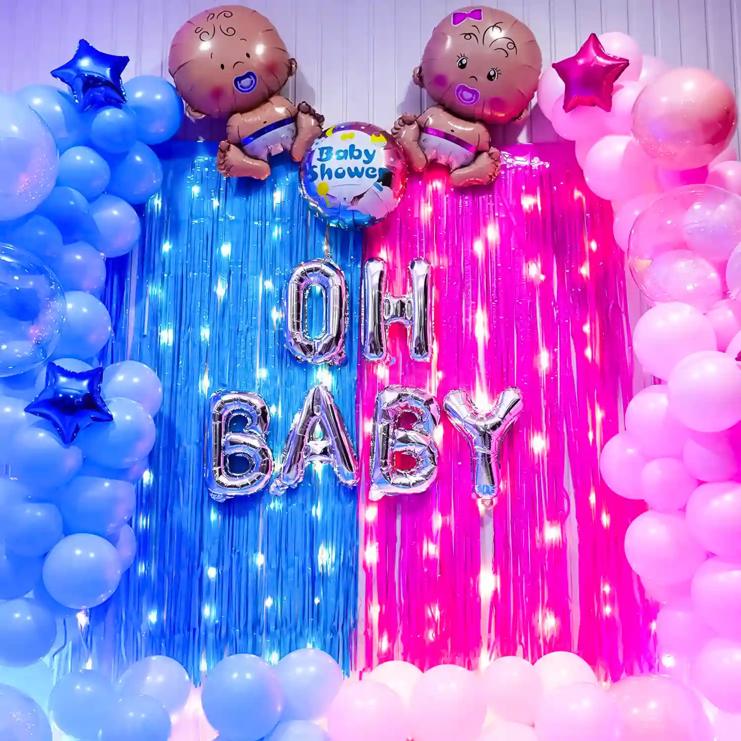 • Arch of 100 Balloons of Color 50 Pastel Blue and 50 Pastel Pink Balloons decorated with 3 Bubble Balloons along 4 Small Star Shape Foil Balloons ( Pink and Blue) along with 30 Pastel Pink and Pastel Blue Balloons scattered on Floor