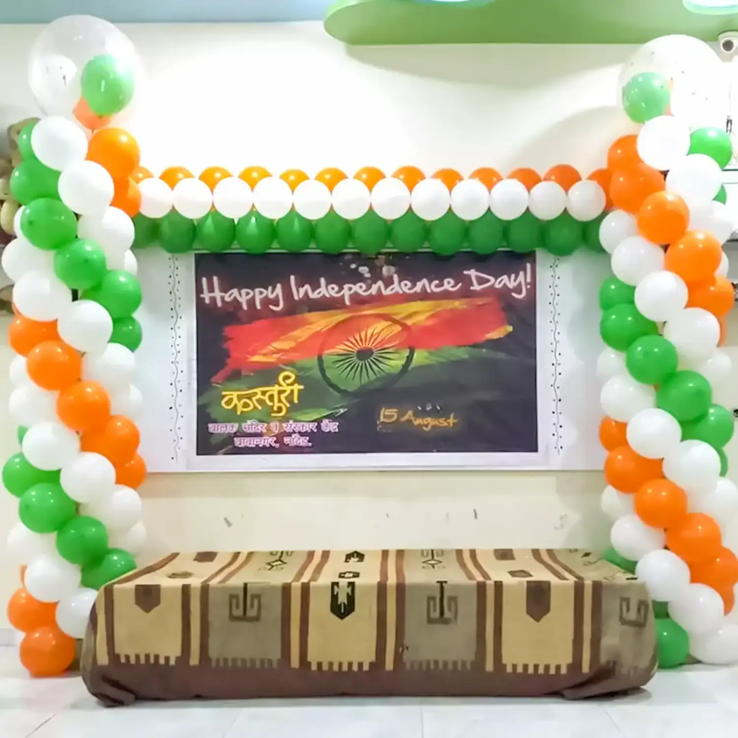 Orange, white and green coloured balloon decoration theme for Independence Day.