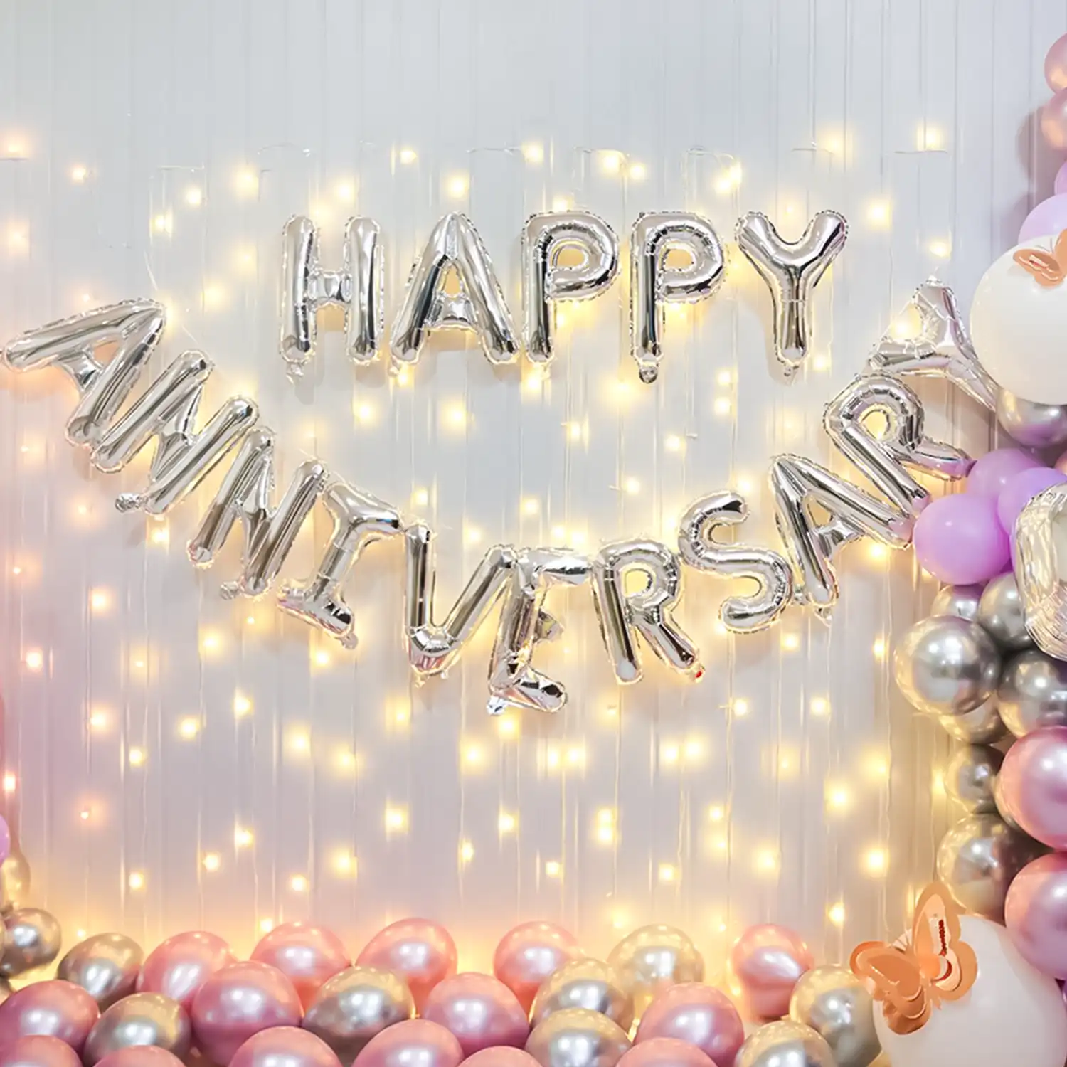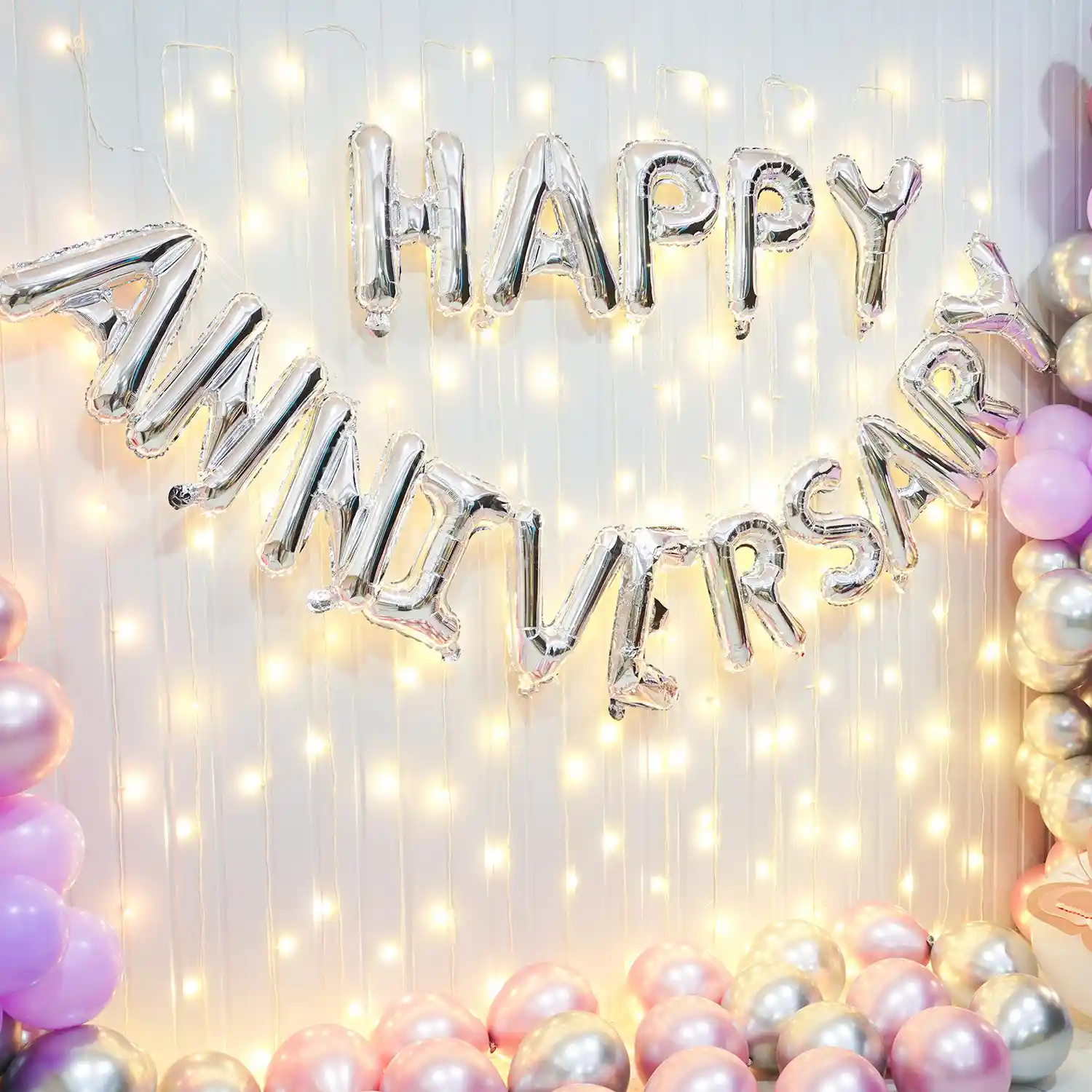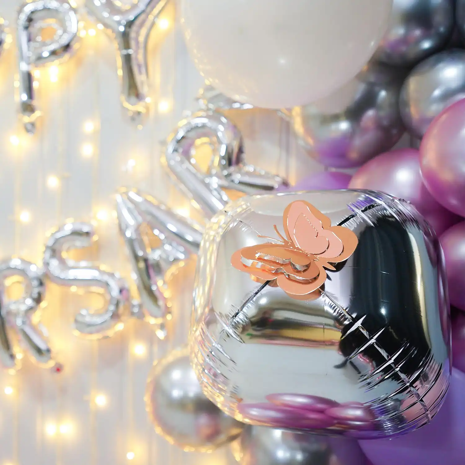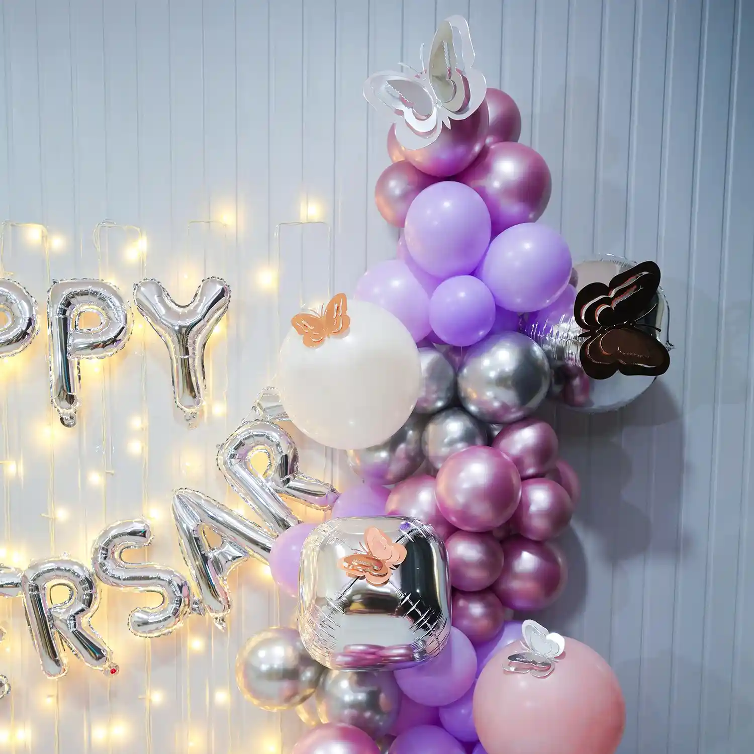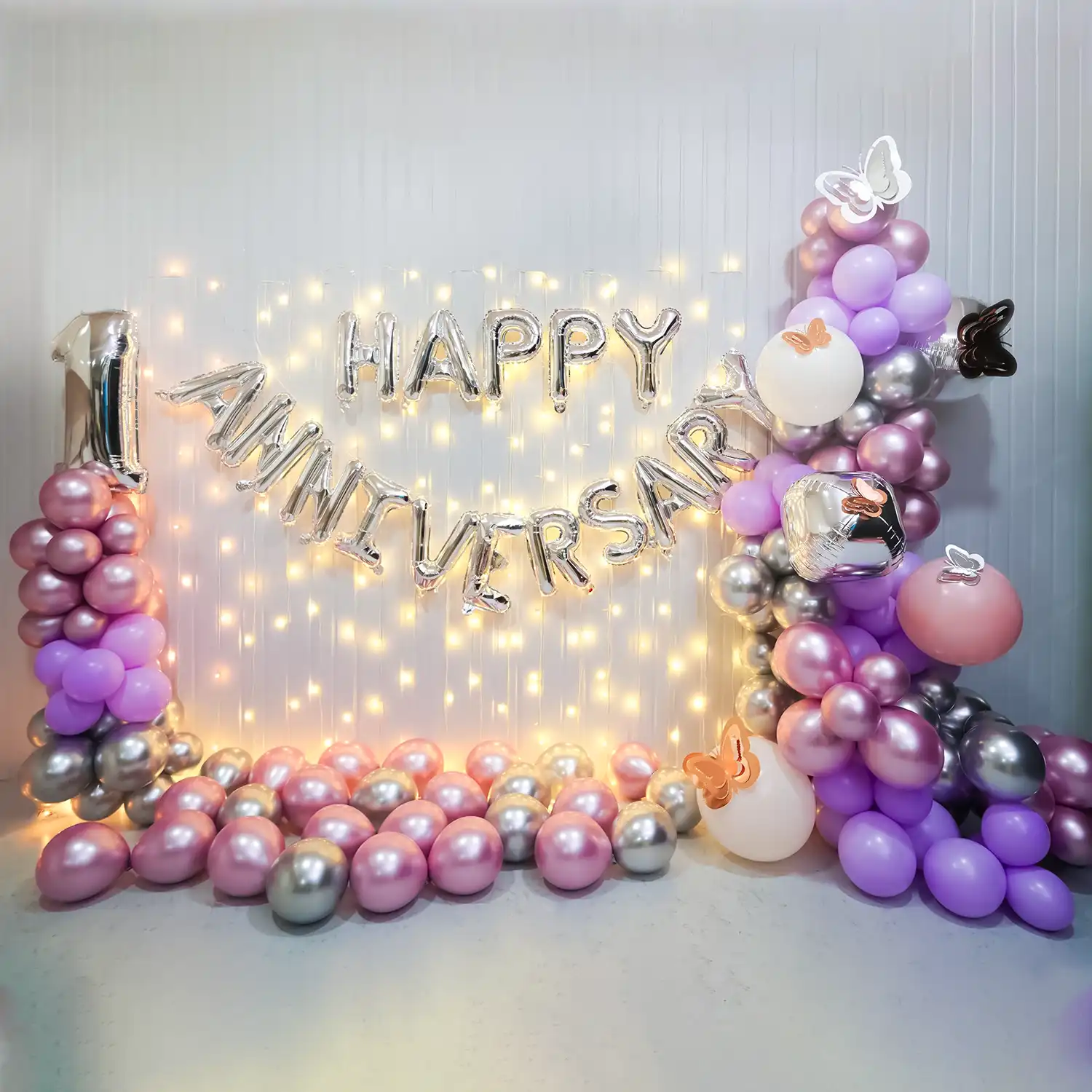 Shimmering lavender and rose balloon backdrop for anniversary celebrations.