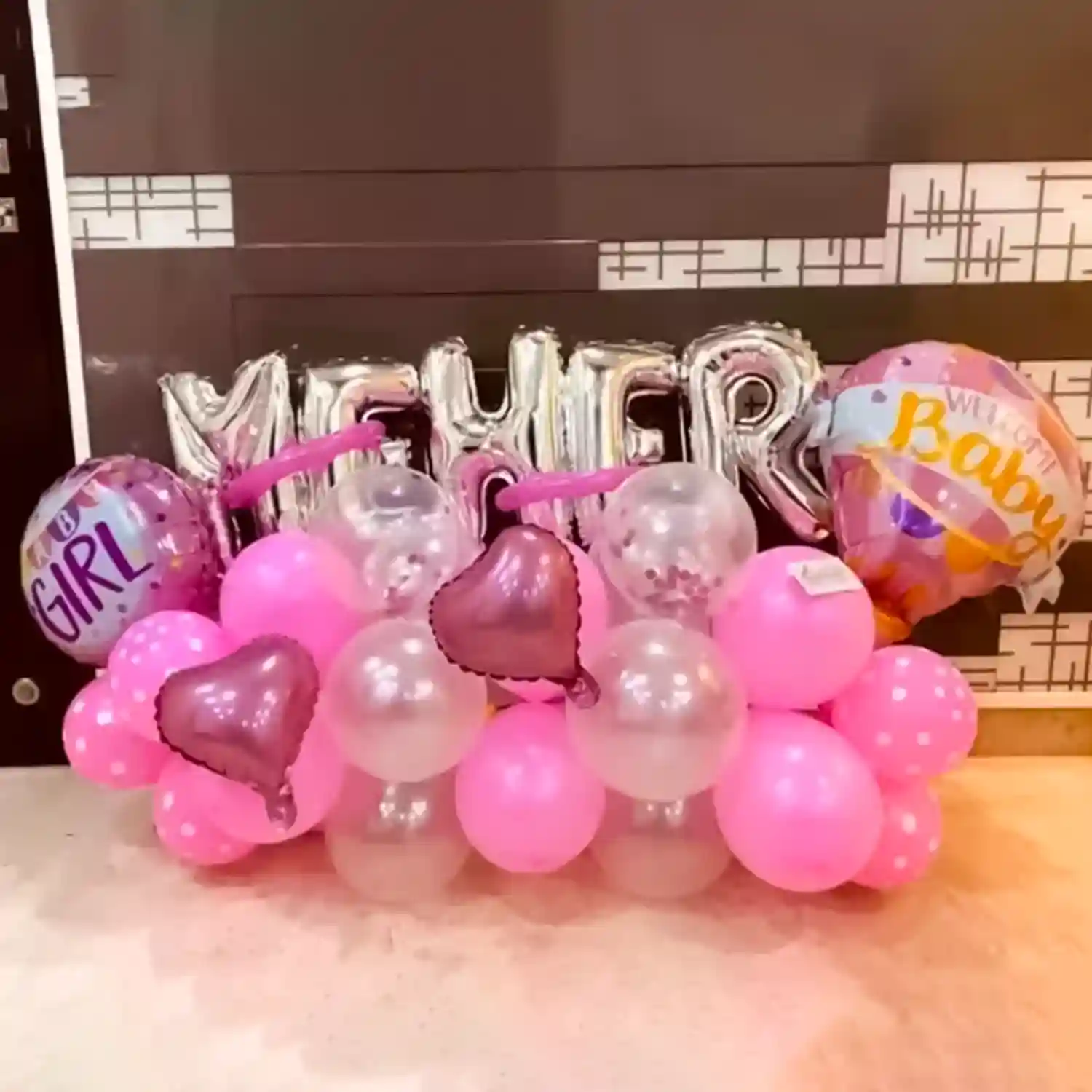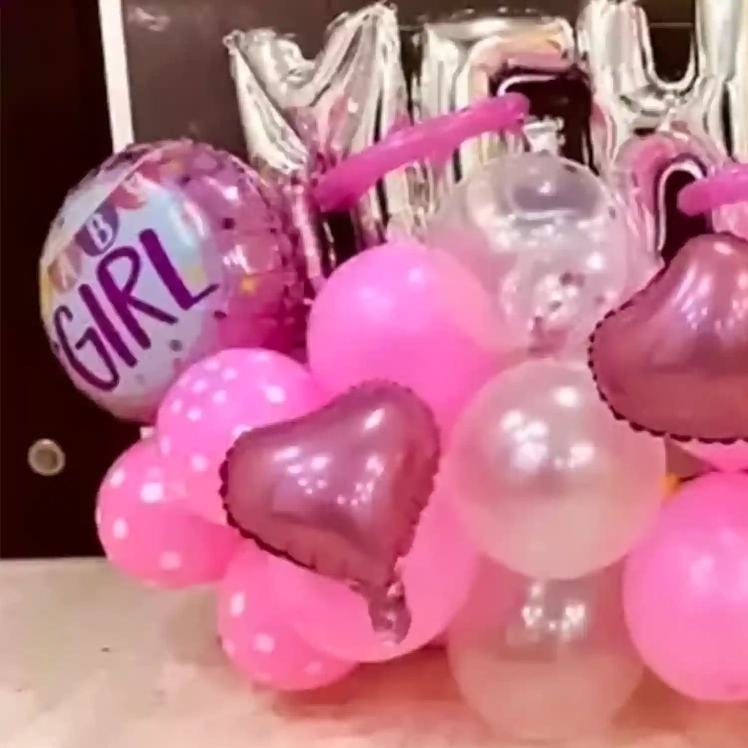 Pretty pink baby girl balloon bouquet with a customized name for decor.