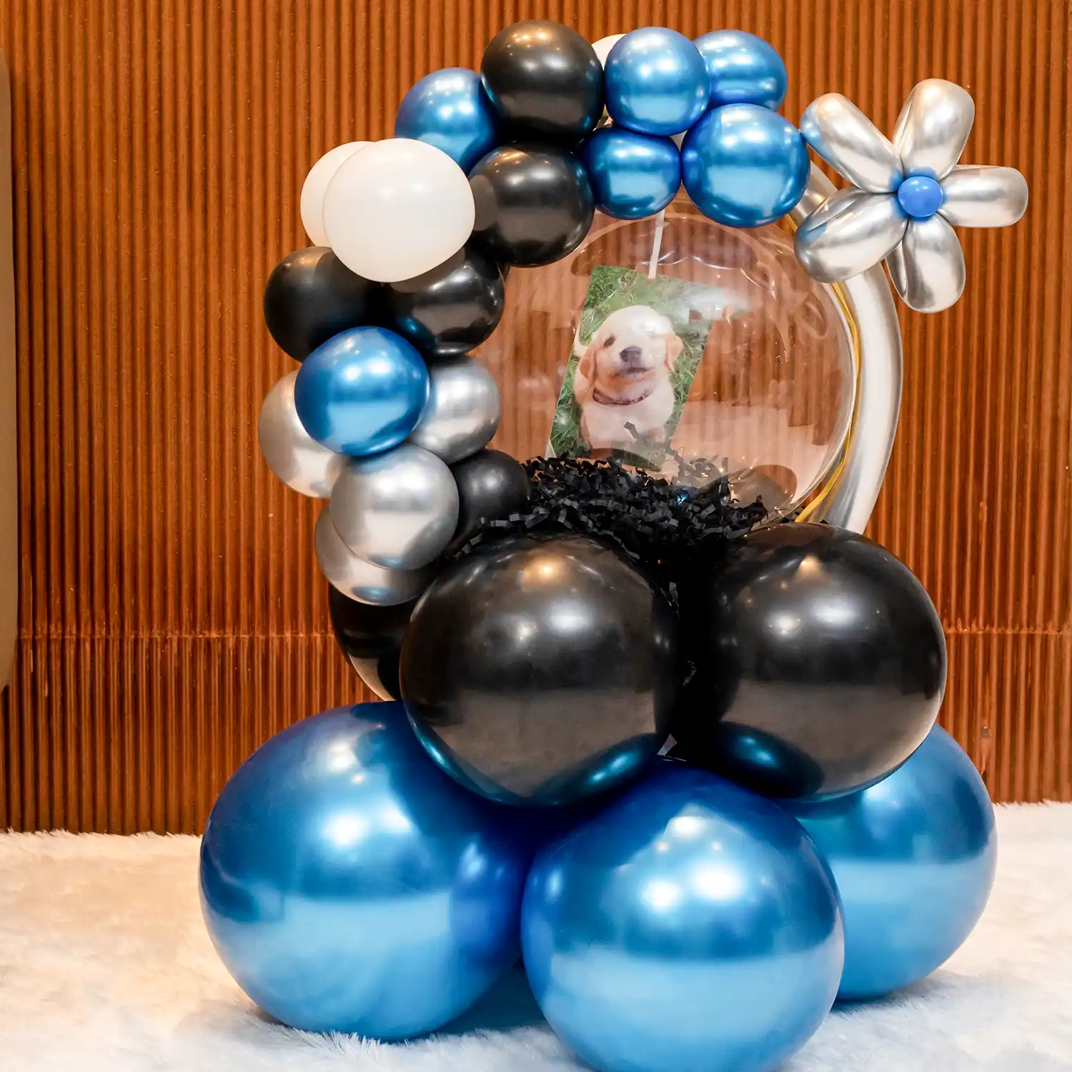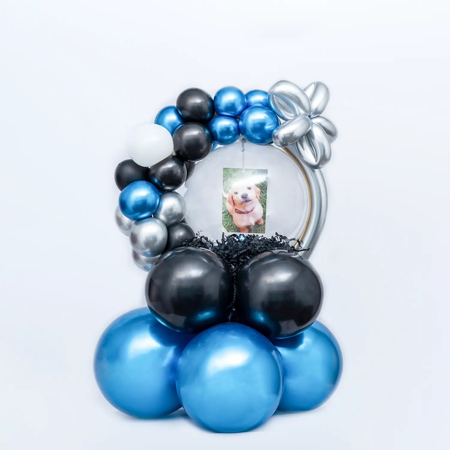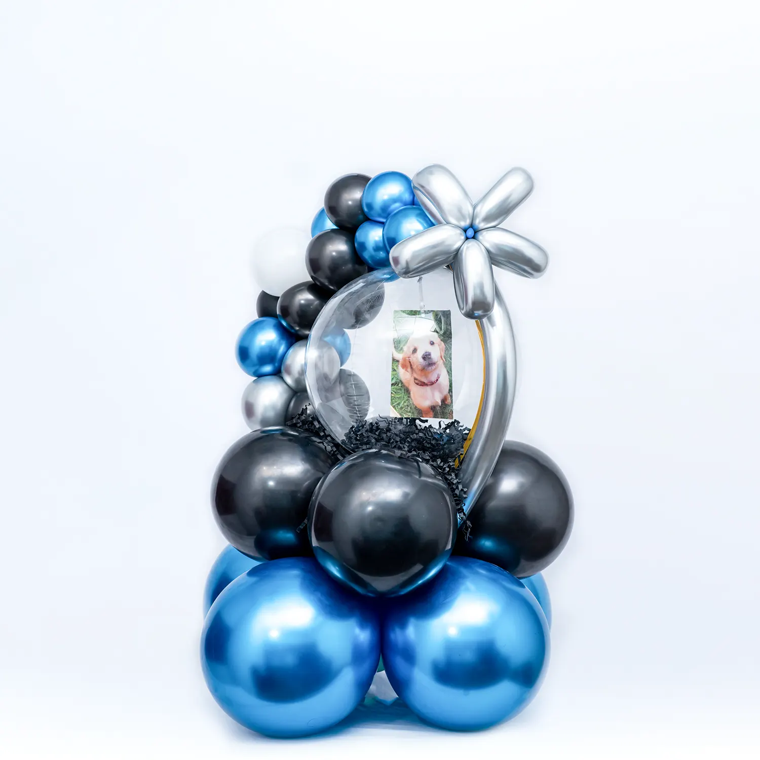 Personalized balloon bouquet with a printed photo.
