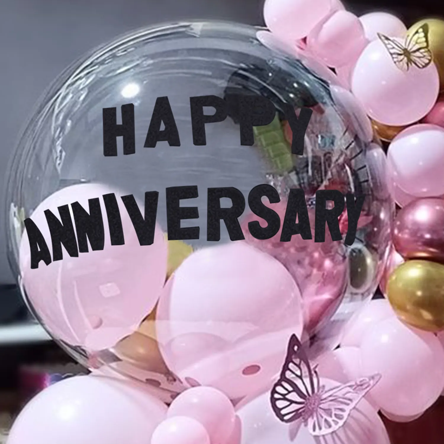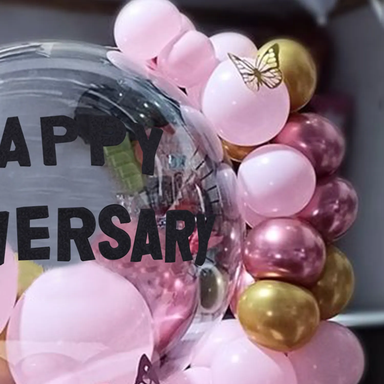 A bunch of loved filled balloons in pink and golden colour for anniversaries.