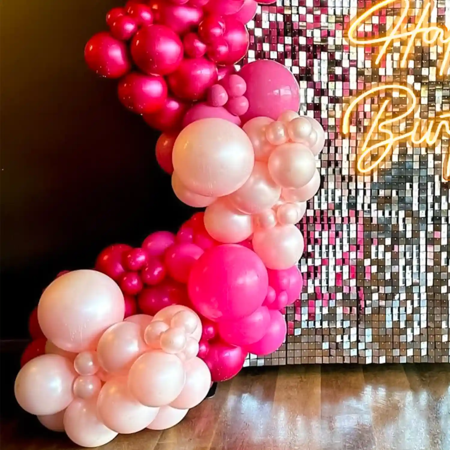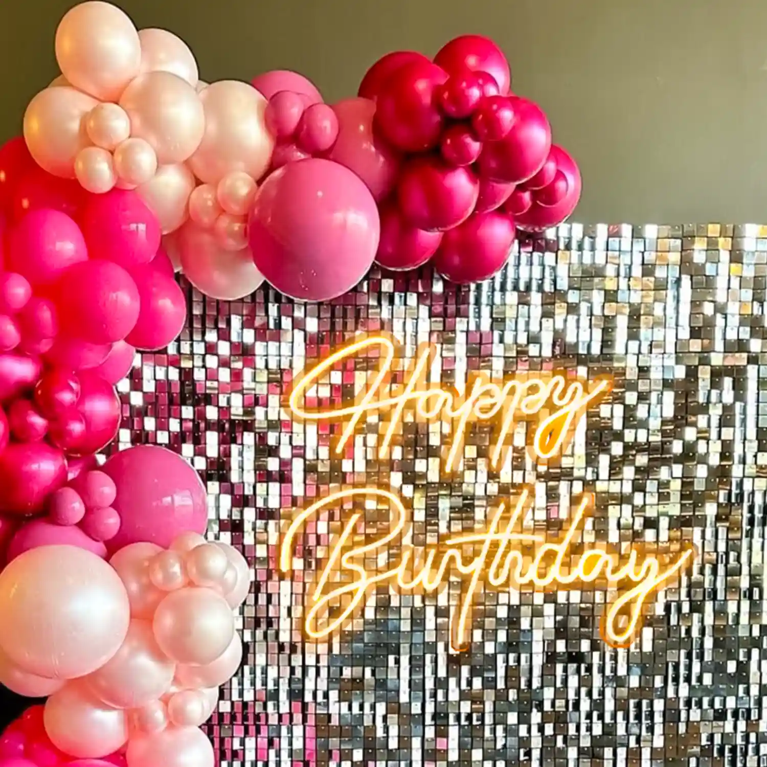 A pretty pink and silver sequin wall backdrop to create birthday memories!