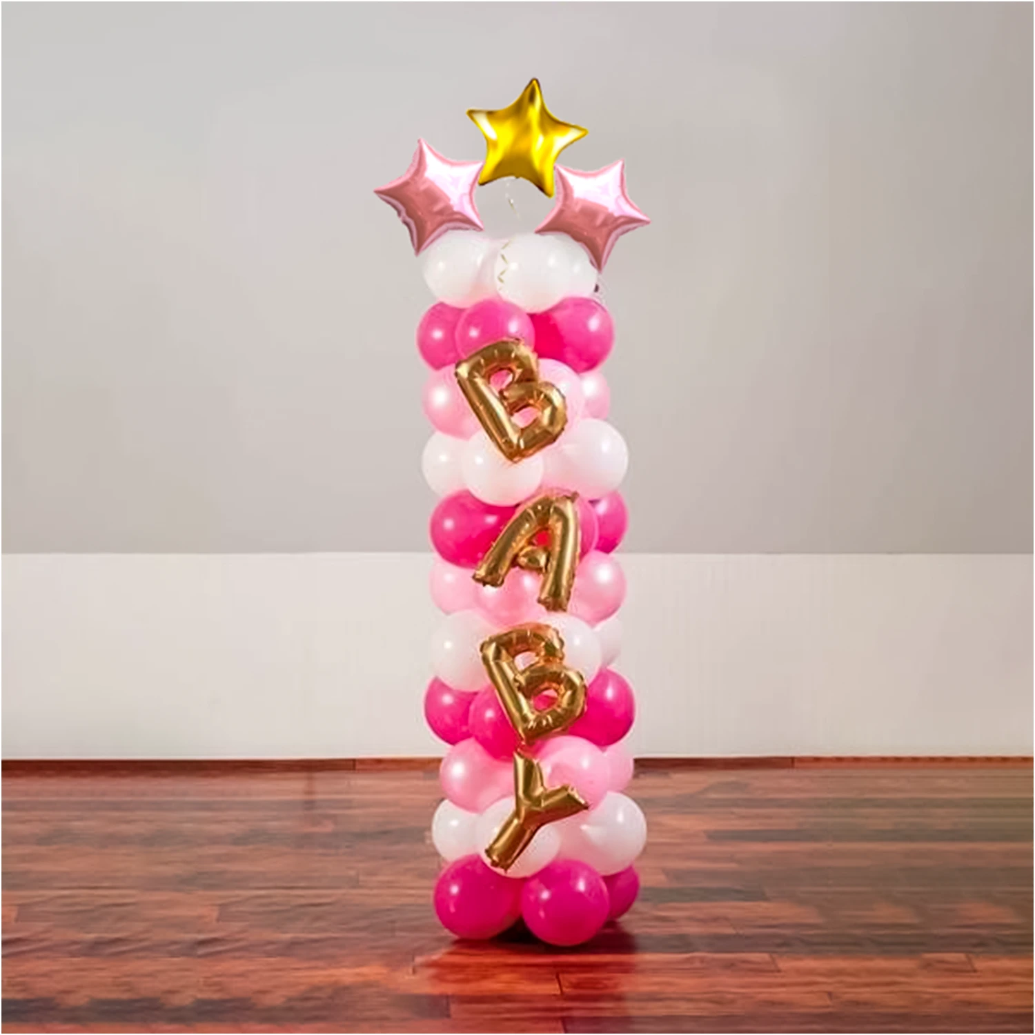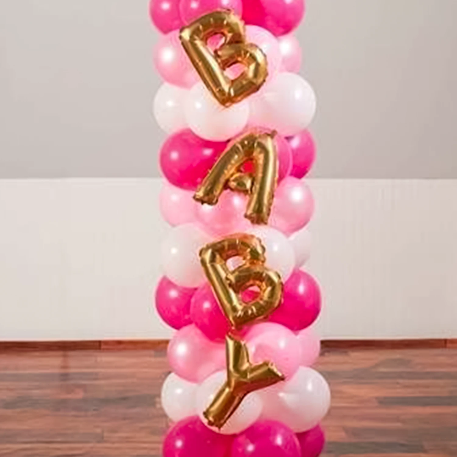 Pretty pink baby girl balloon bouquet with a customized name for decor.