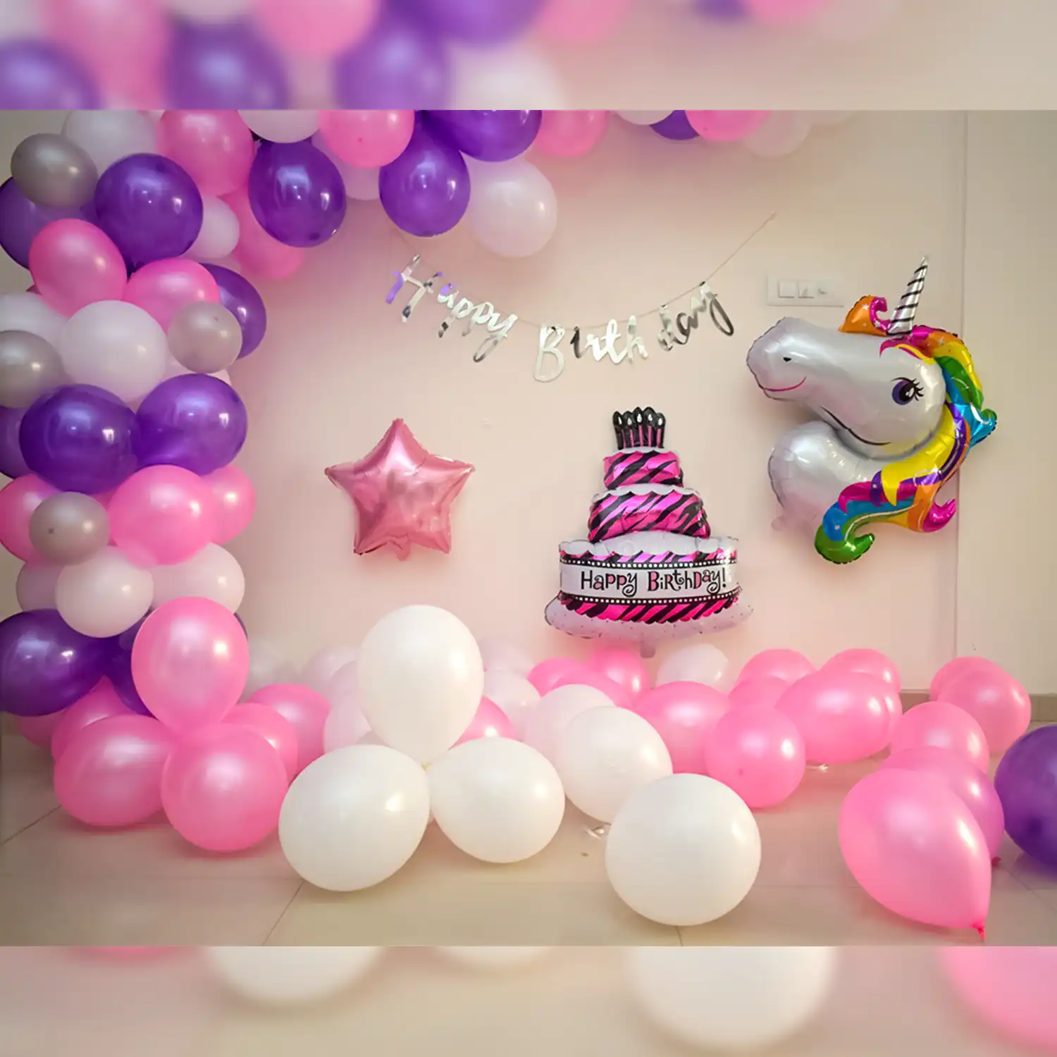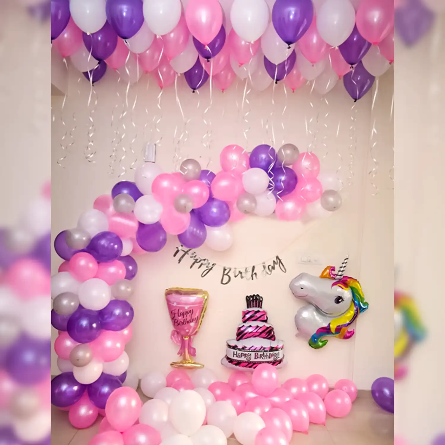 A beautiful balloon decoration idea for birthday celebrations at home.