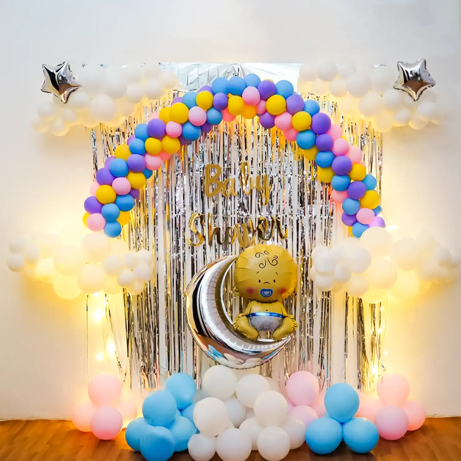 • 4 Clouds Formed with 80 White Latex Balloons and Decorated with 2 Silver Star Shape Foil Balloons (8 inch)