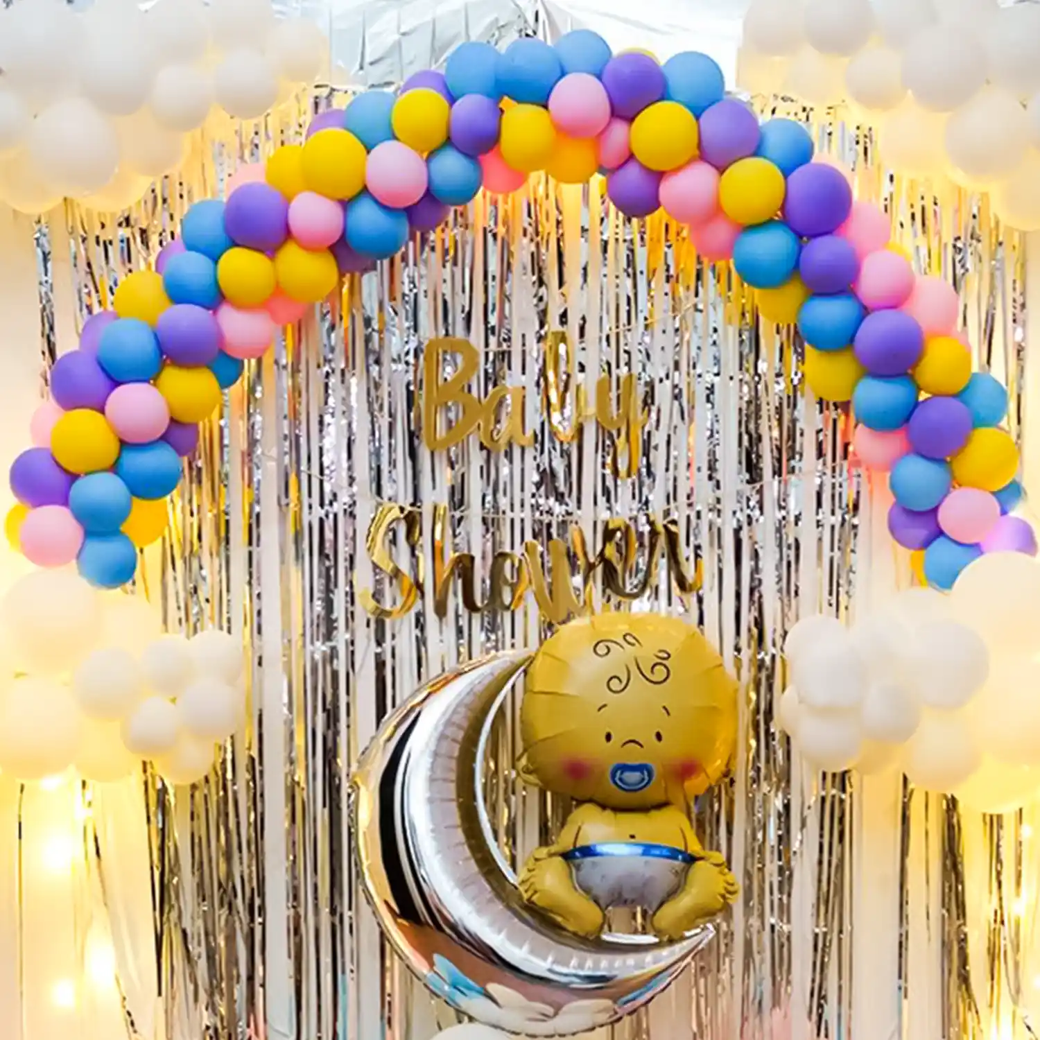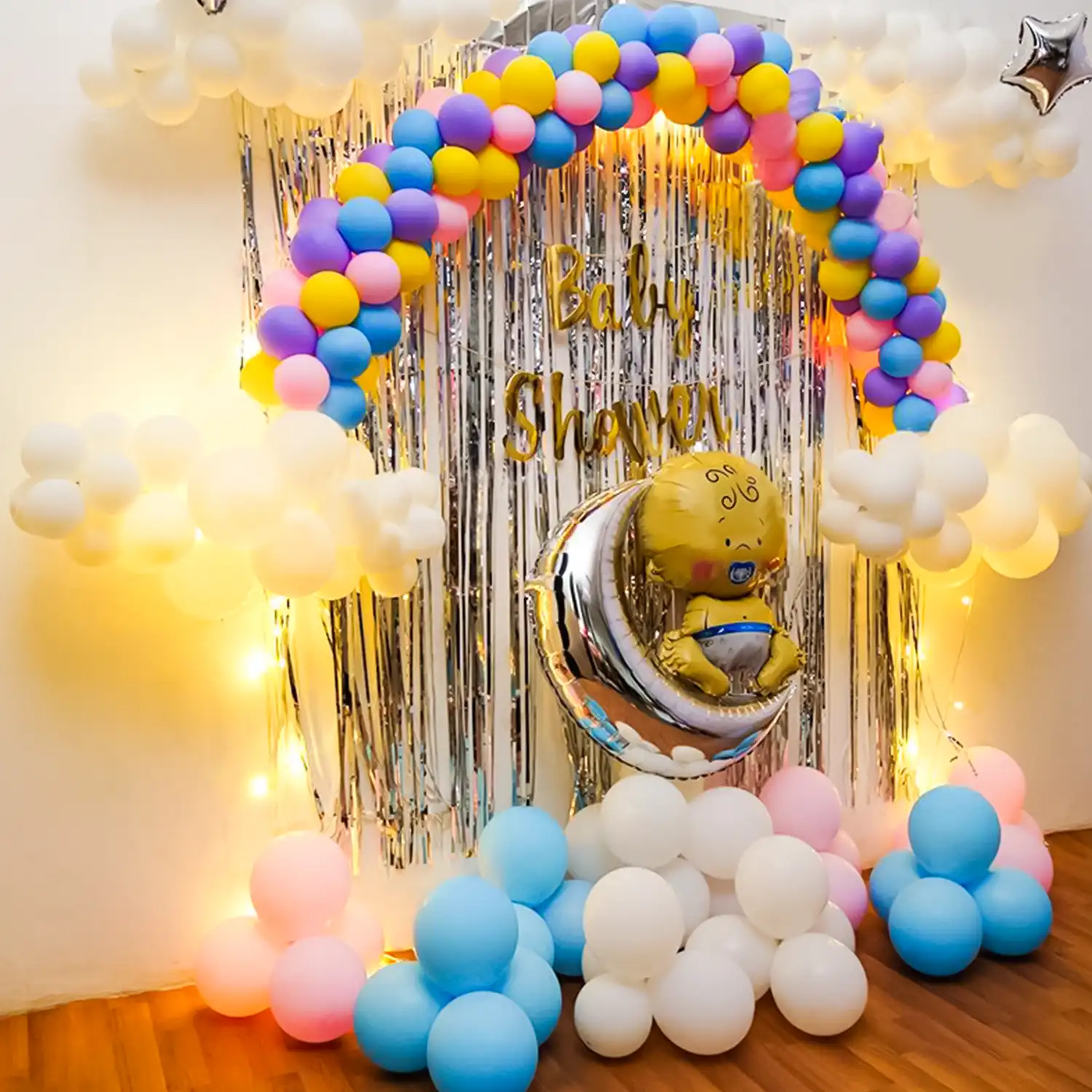A colourful decor with rainbow and clouds for baby shower ceremonies.
