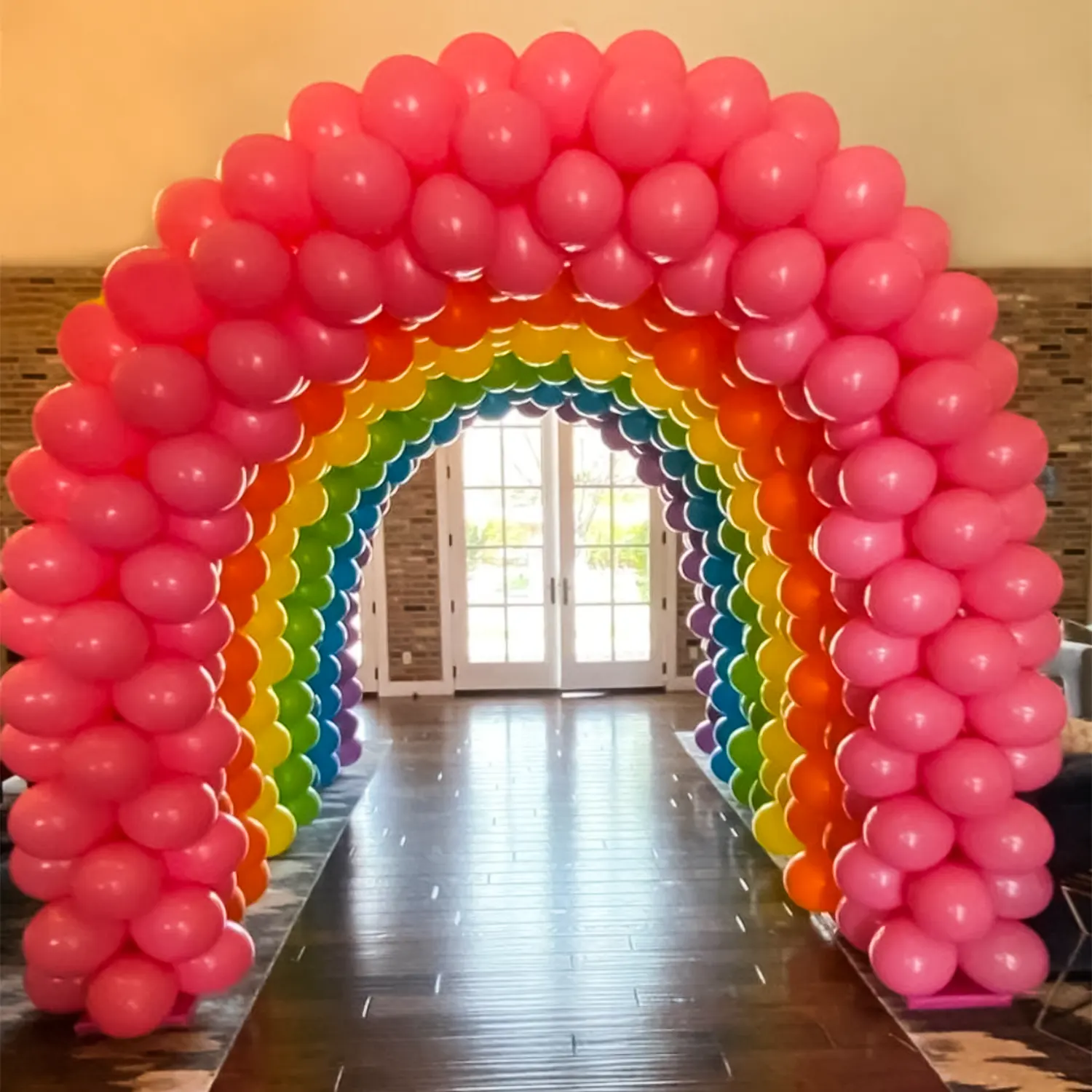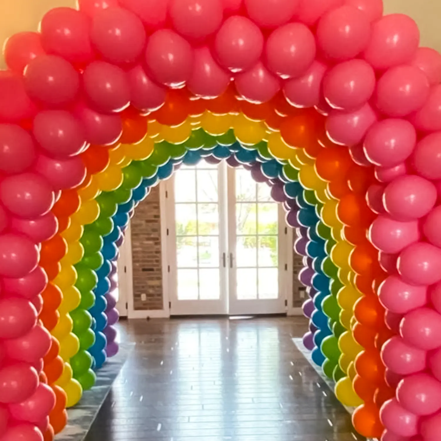 Follow this colourful rainbow tunnel made with balloons for a celebration.