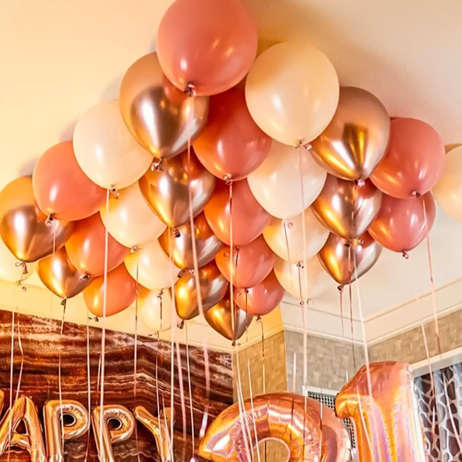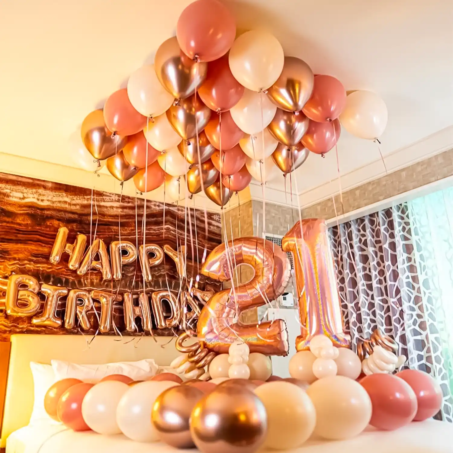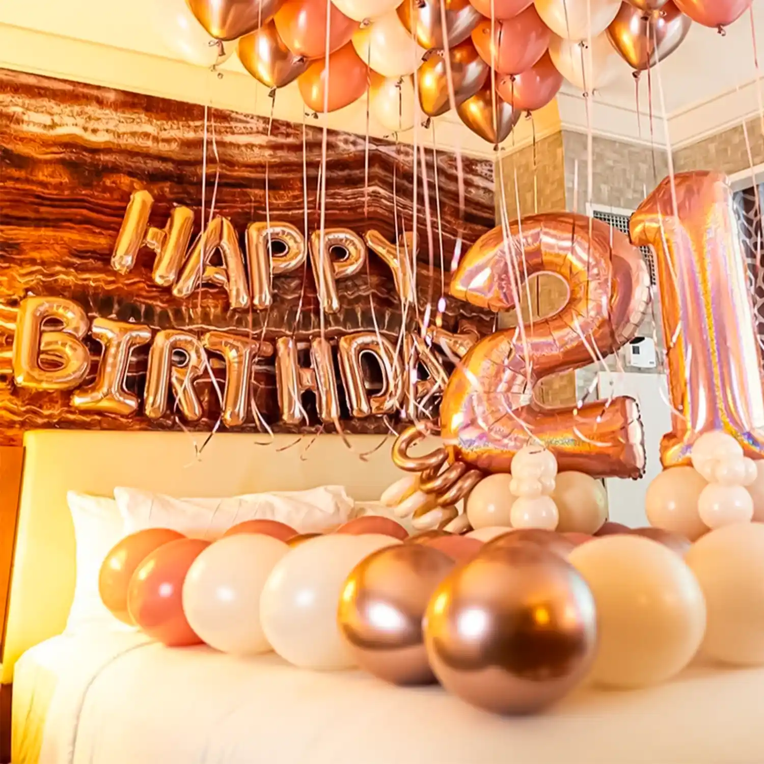 Add an extra layer of happiness to the celebration with this rose gold birthday room decoration!