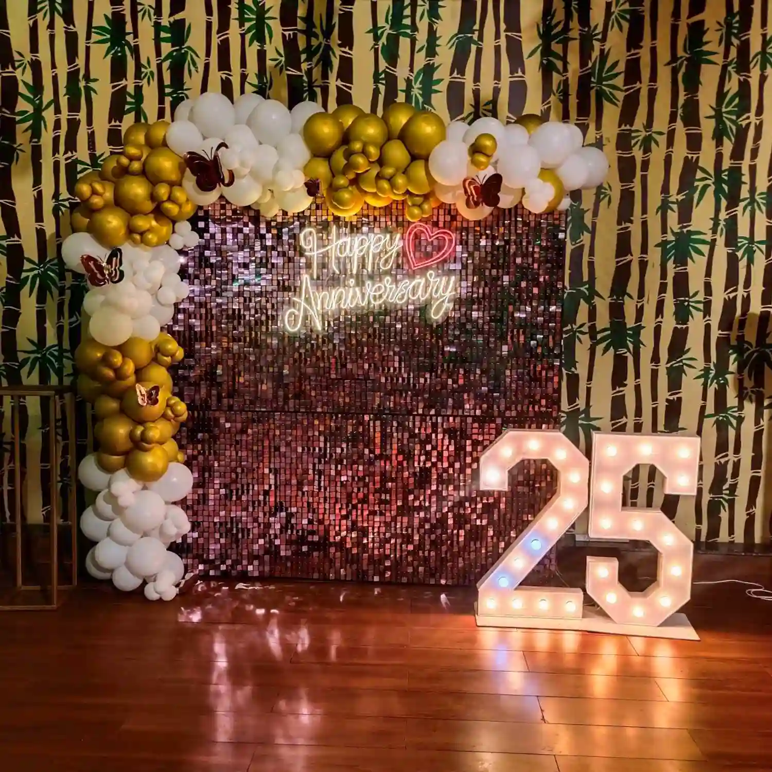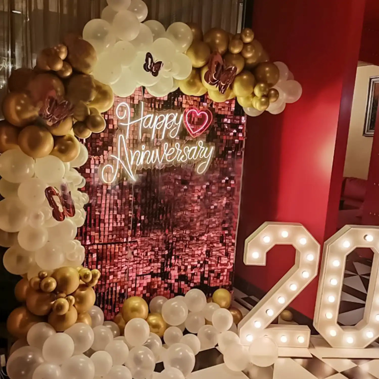 Shimmering with love, this is a rose gold sequin decoration idea for anniversaries.