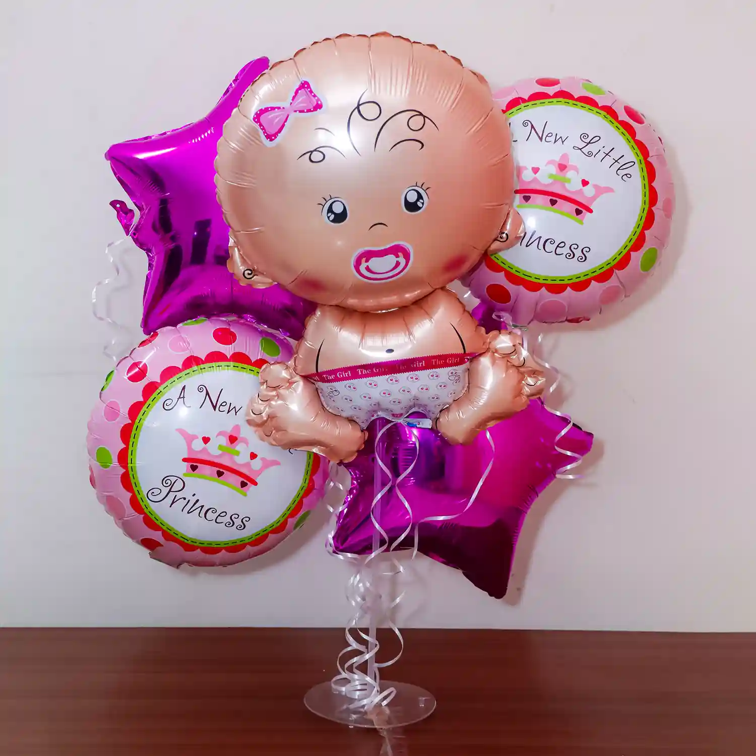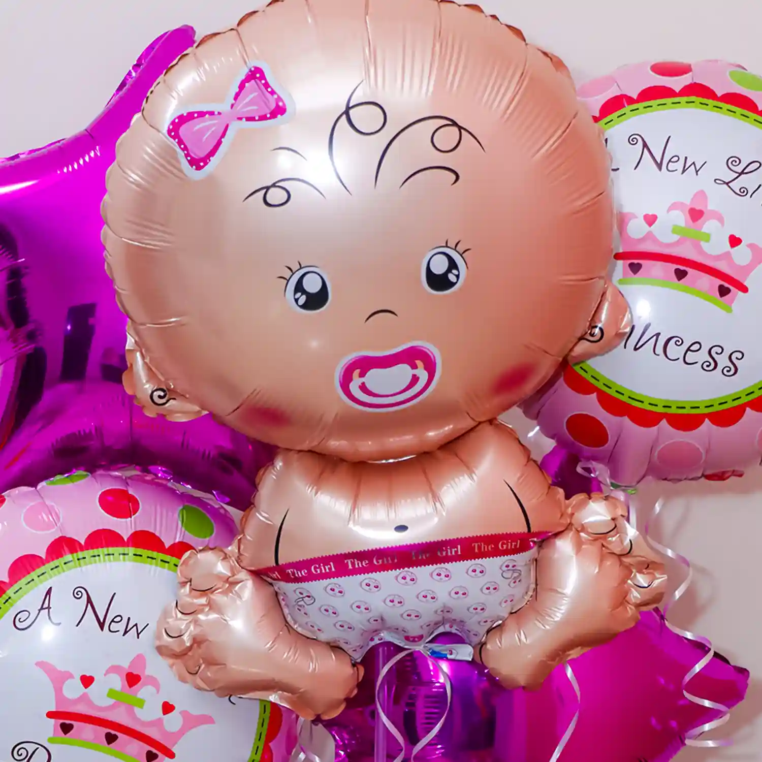 Pretty pink baby girl balloon bouquet with a customized name for decor.