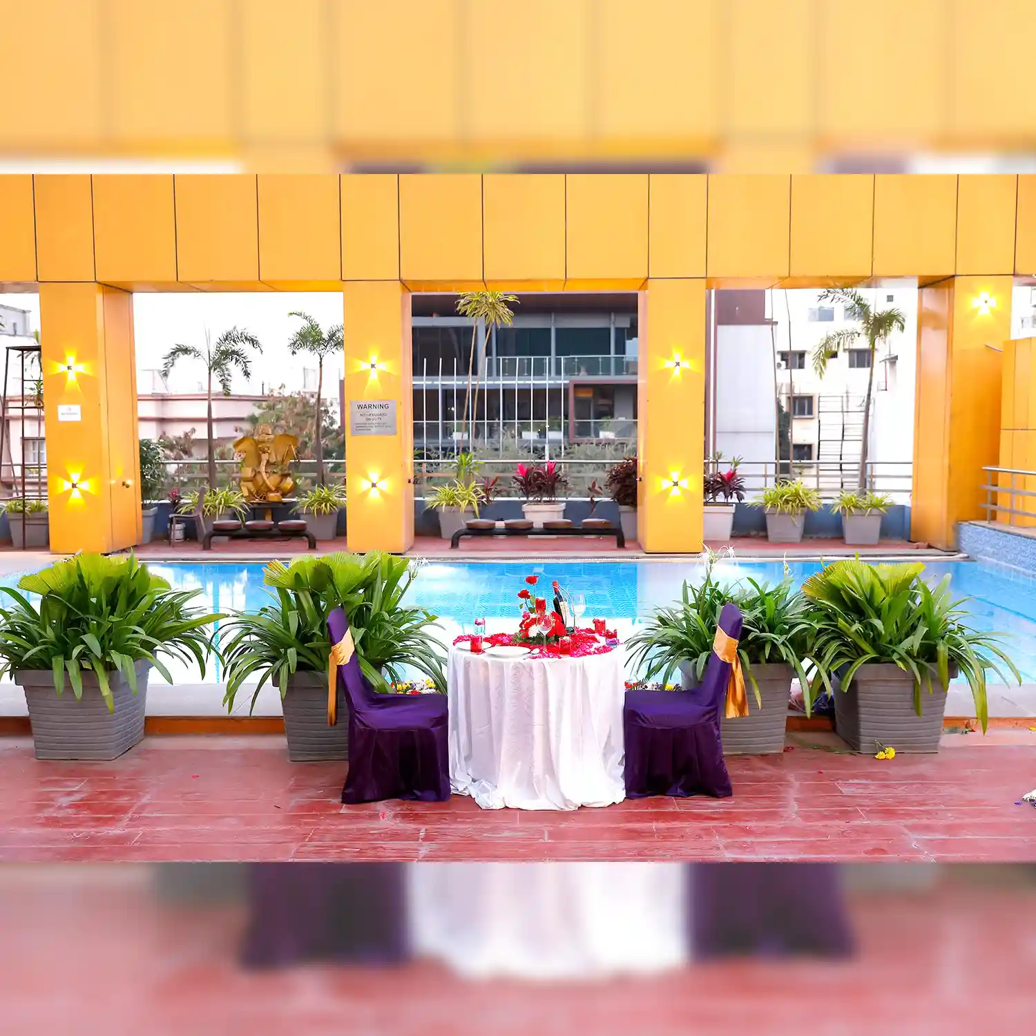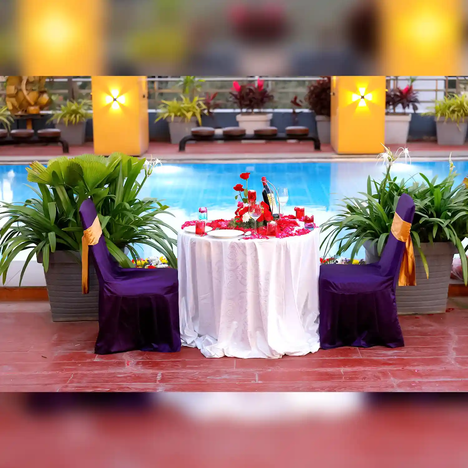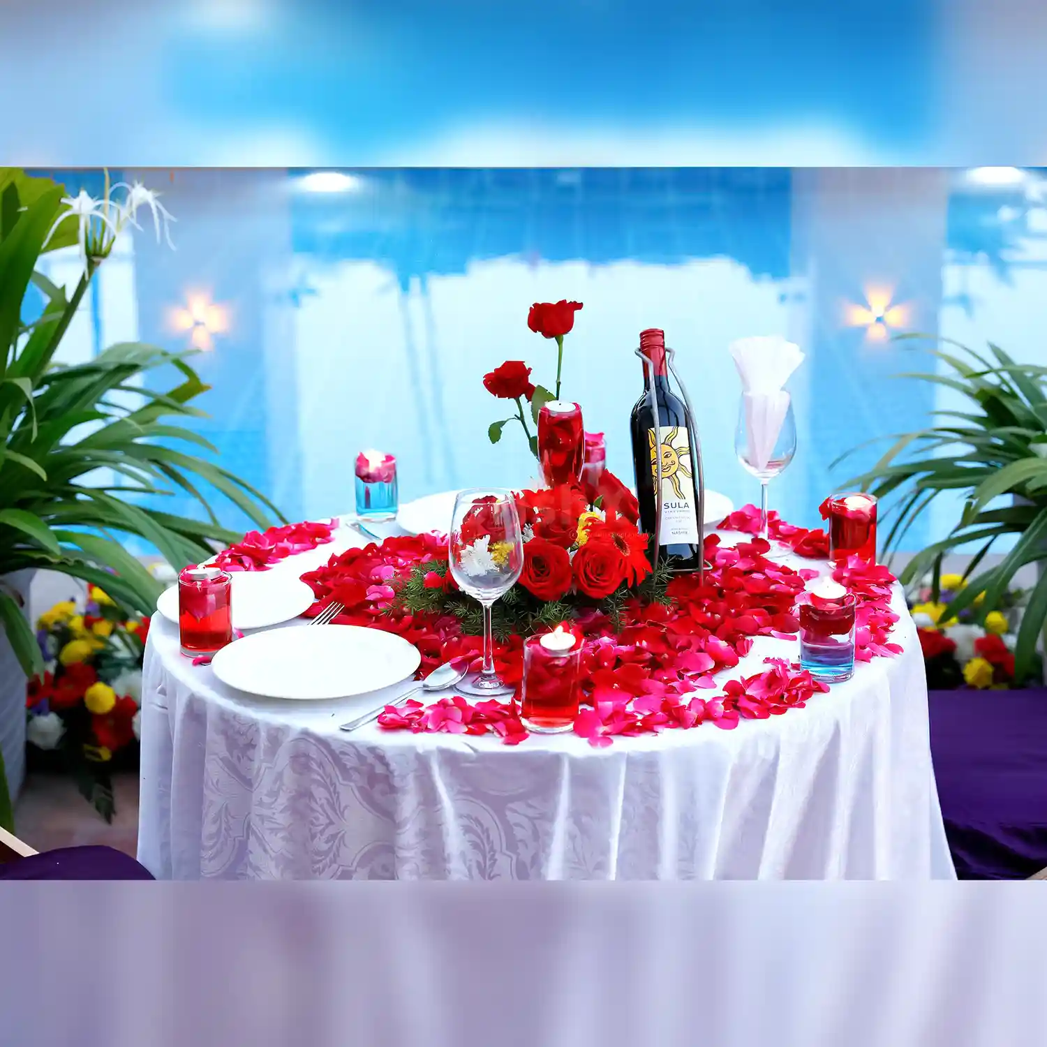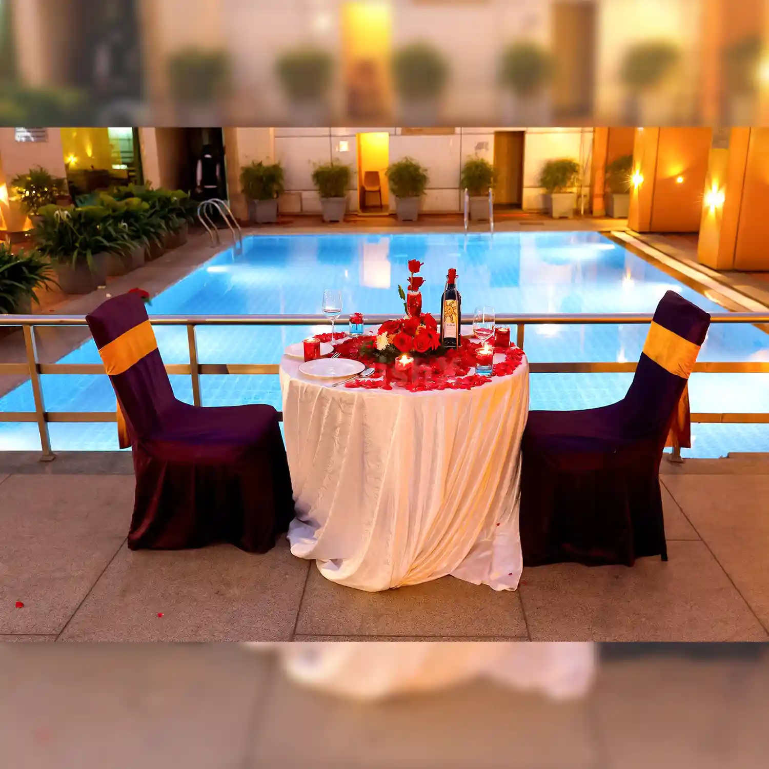 A poolside candlelight dinner date set against the shimmering waters and starry skies!