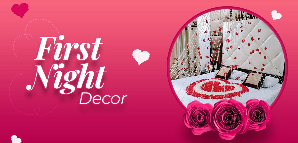 Get your room decorated beautifully for your first night. The special moment must be memorable for both of you. Let the colour of red rose petals create a romantic vibe, the aroma of scented candles infuse romance, the canopy decor make you both feel cosy and heart-shaped balloon decor fill you both with excitement. Show that you will always care for them by putting in efforts for your relationship. Choose a romantic room decor theme from our website and let our team execute it with perfection. The romantic room decoration will leave both of you surprised.