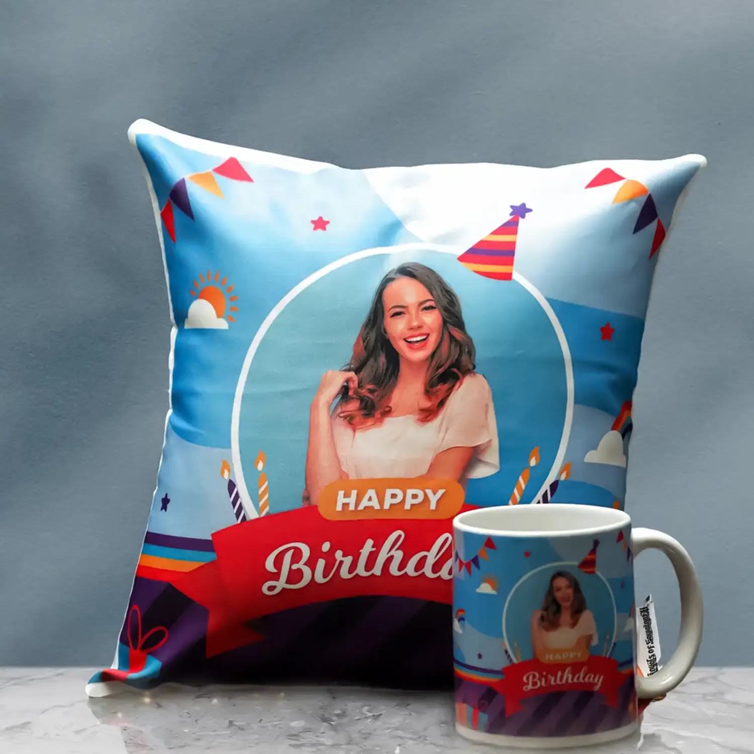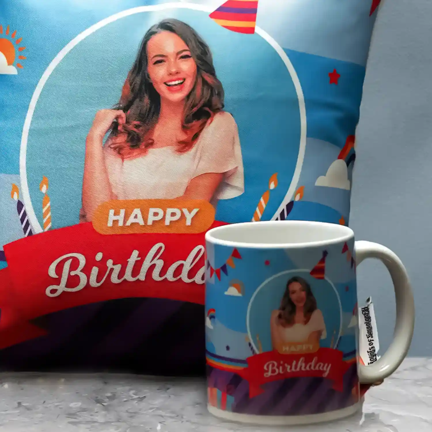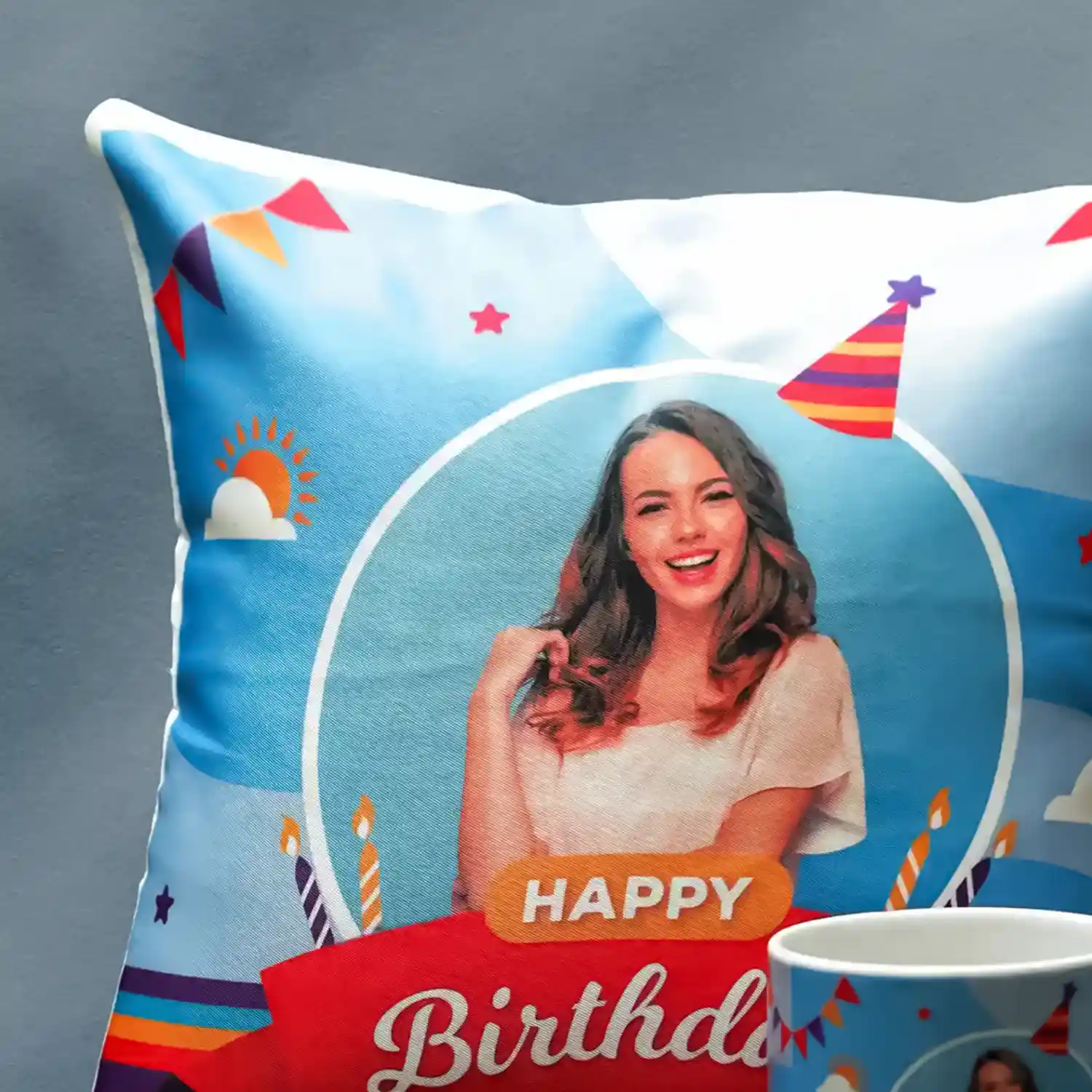 Birthday Special Personalised Blue Hat Printed Cushion-Mug Combo