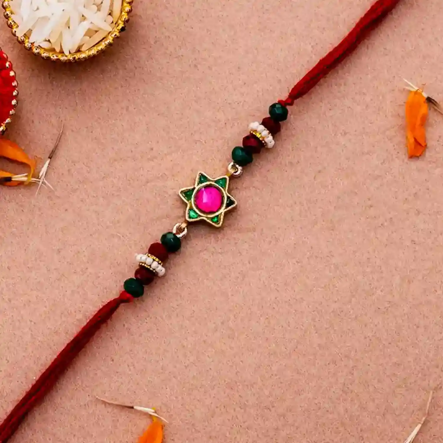 Highlighting a flower, this is a fancy Silver Rakhi with Kundan and pearls.
