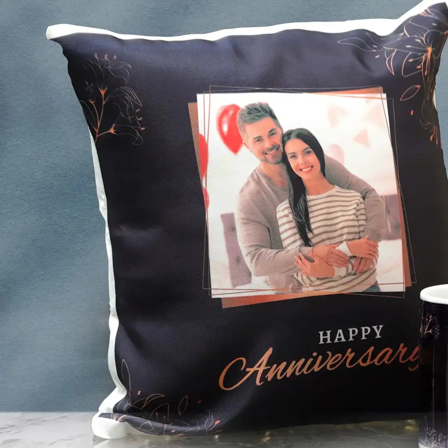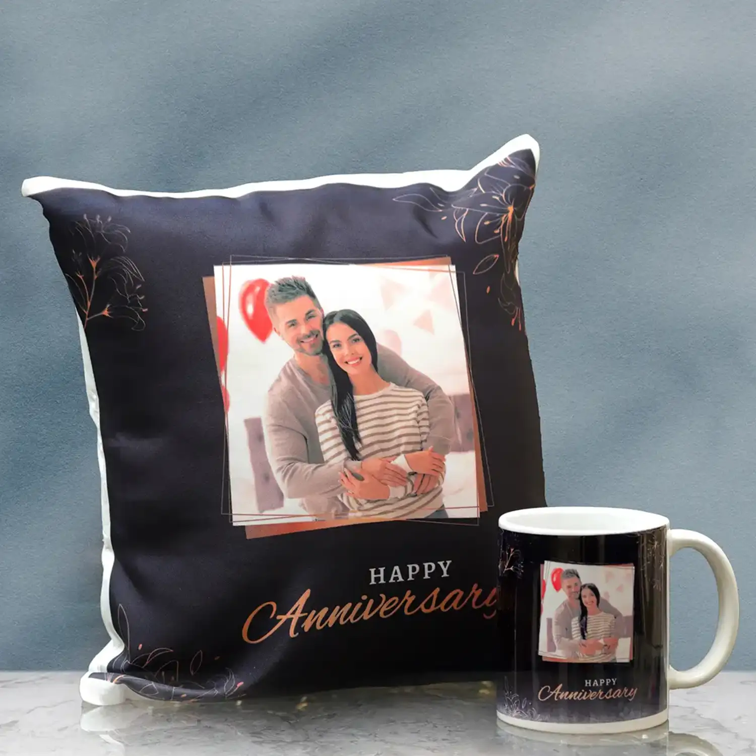 The personalized photo gift combo has a cushion and a mug. It can be the best anniversary gift.