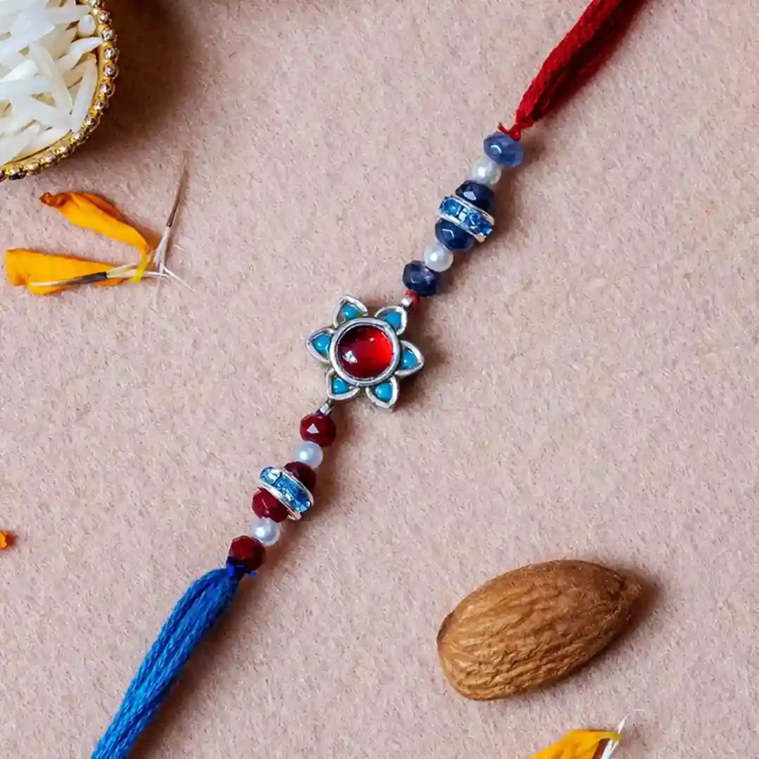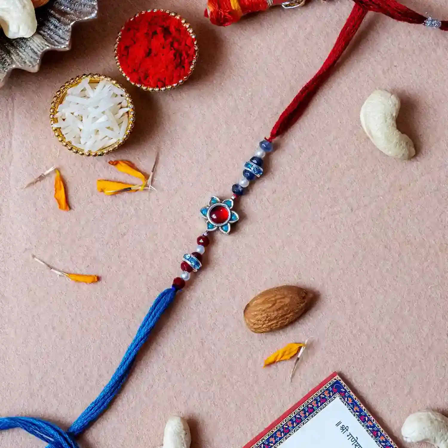 Highlighting a flower, this is a fancy Silver Rakhi with Kundan and pearls.