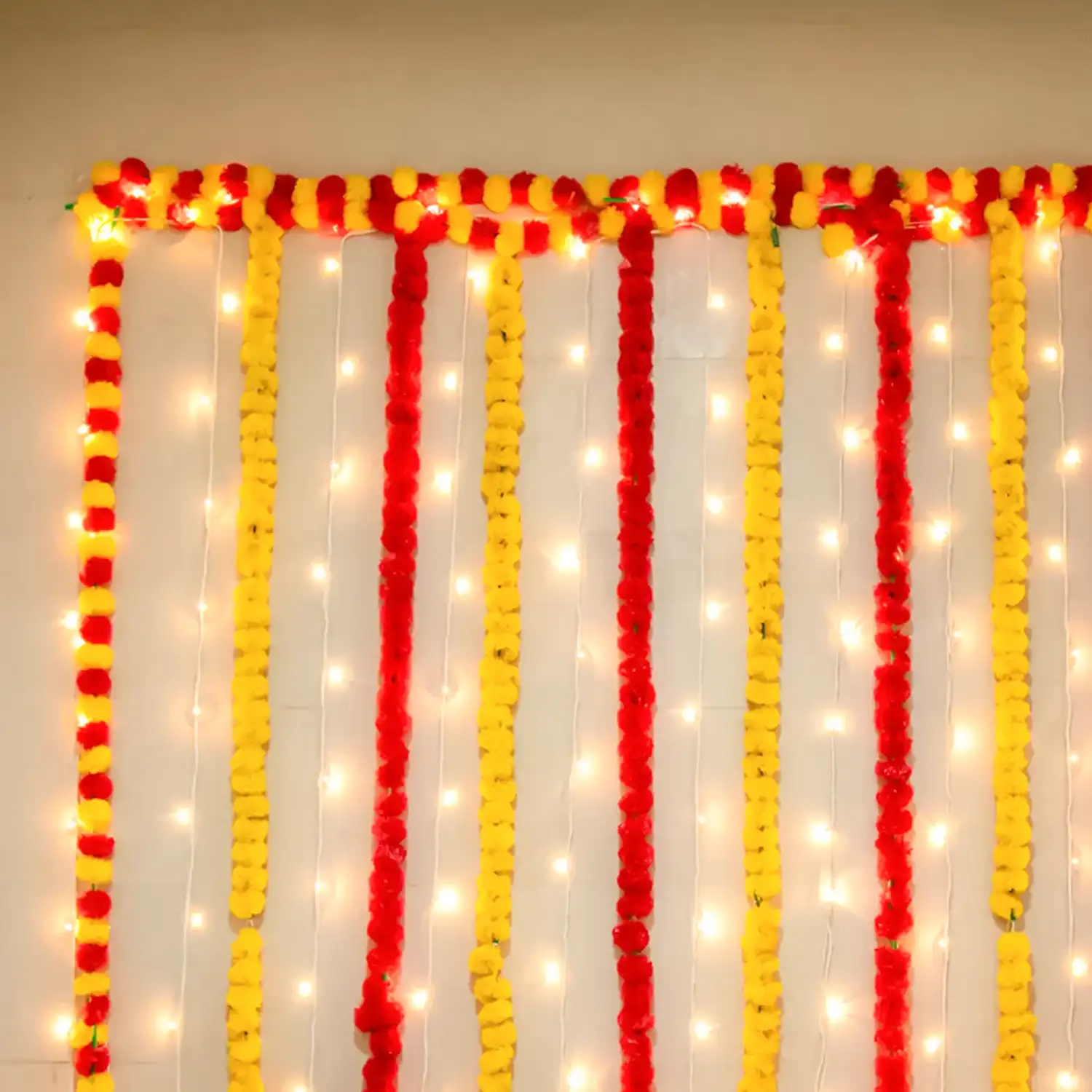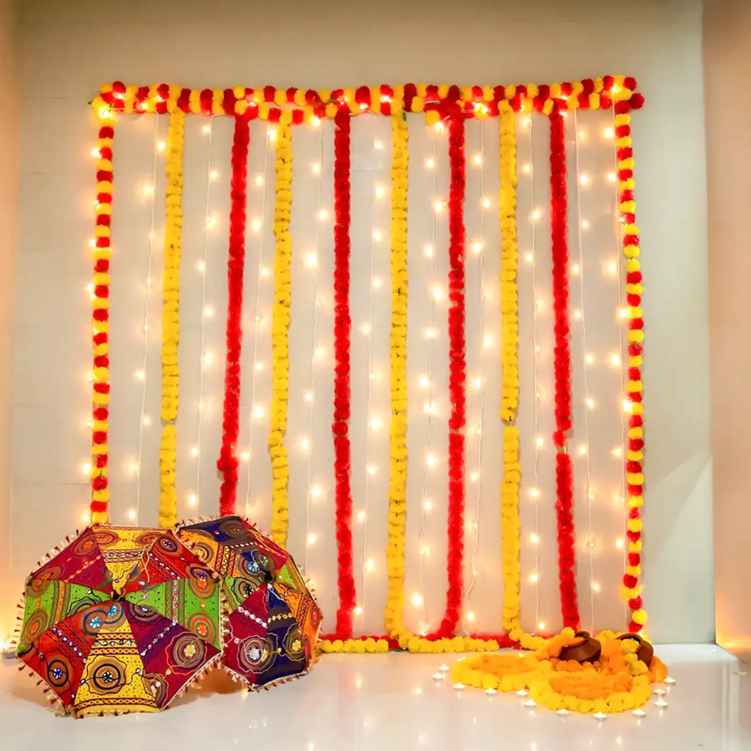 Colourful flower ring decoration with curtains, fairy lights and more.