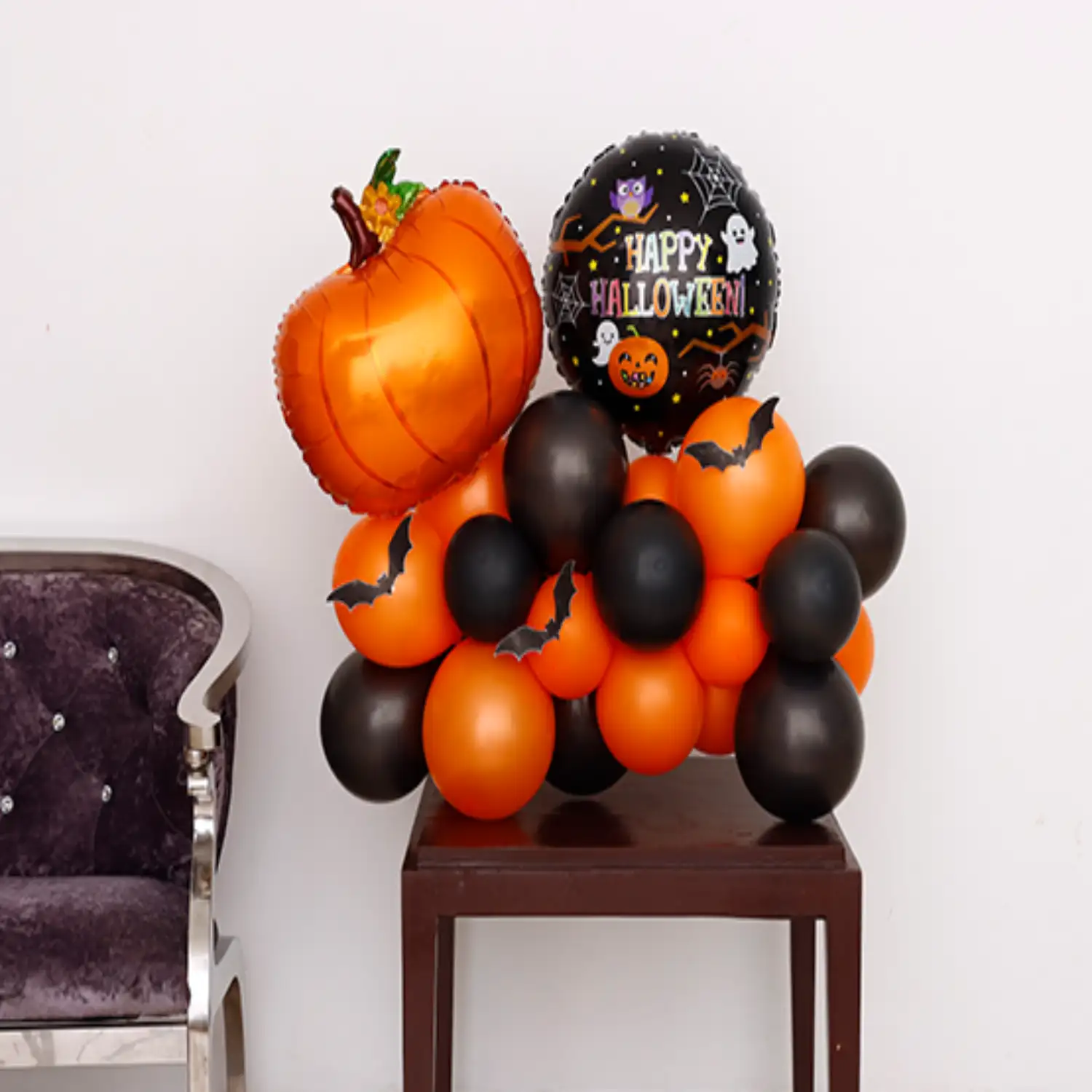 • The Halloween-themed balloon bouquet has a pumpkin foil balloon and a "Happy Halloween" printed balloon.